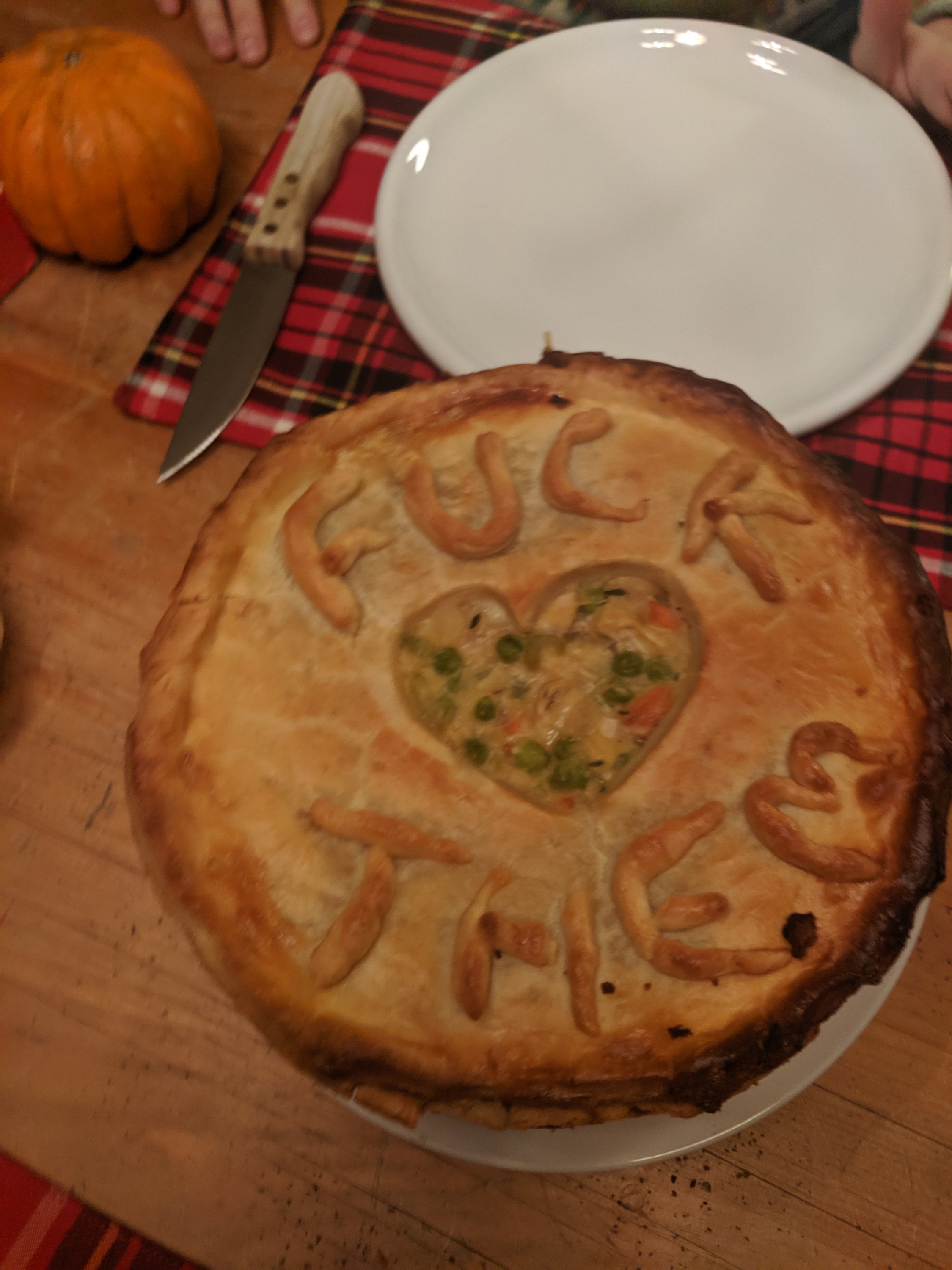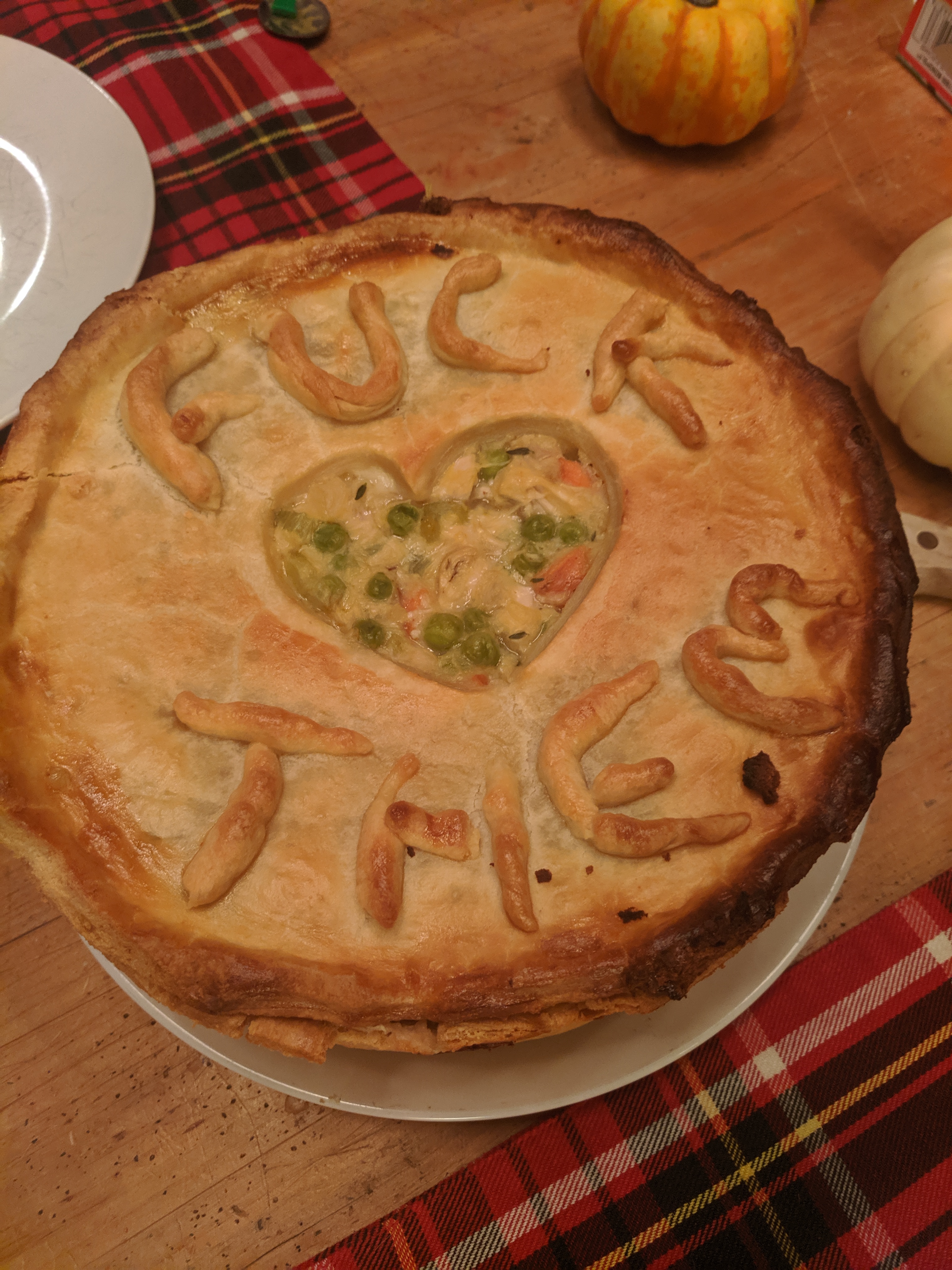 Karolina made a chicken pot pie in celebration. She carved the words, “FUCK THEM” into the crust.