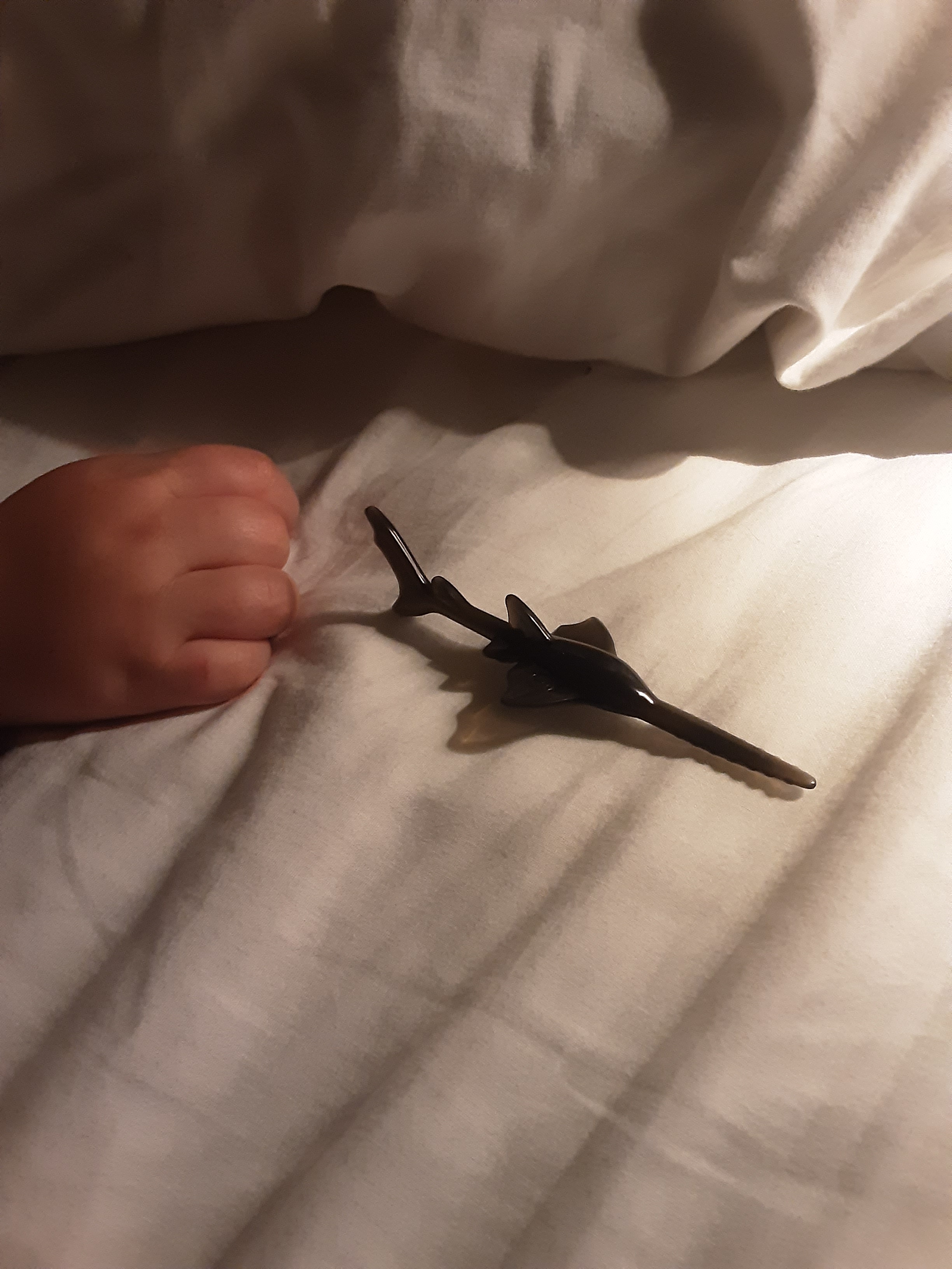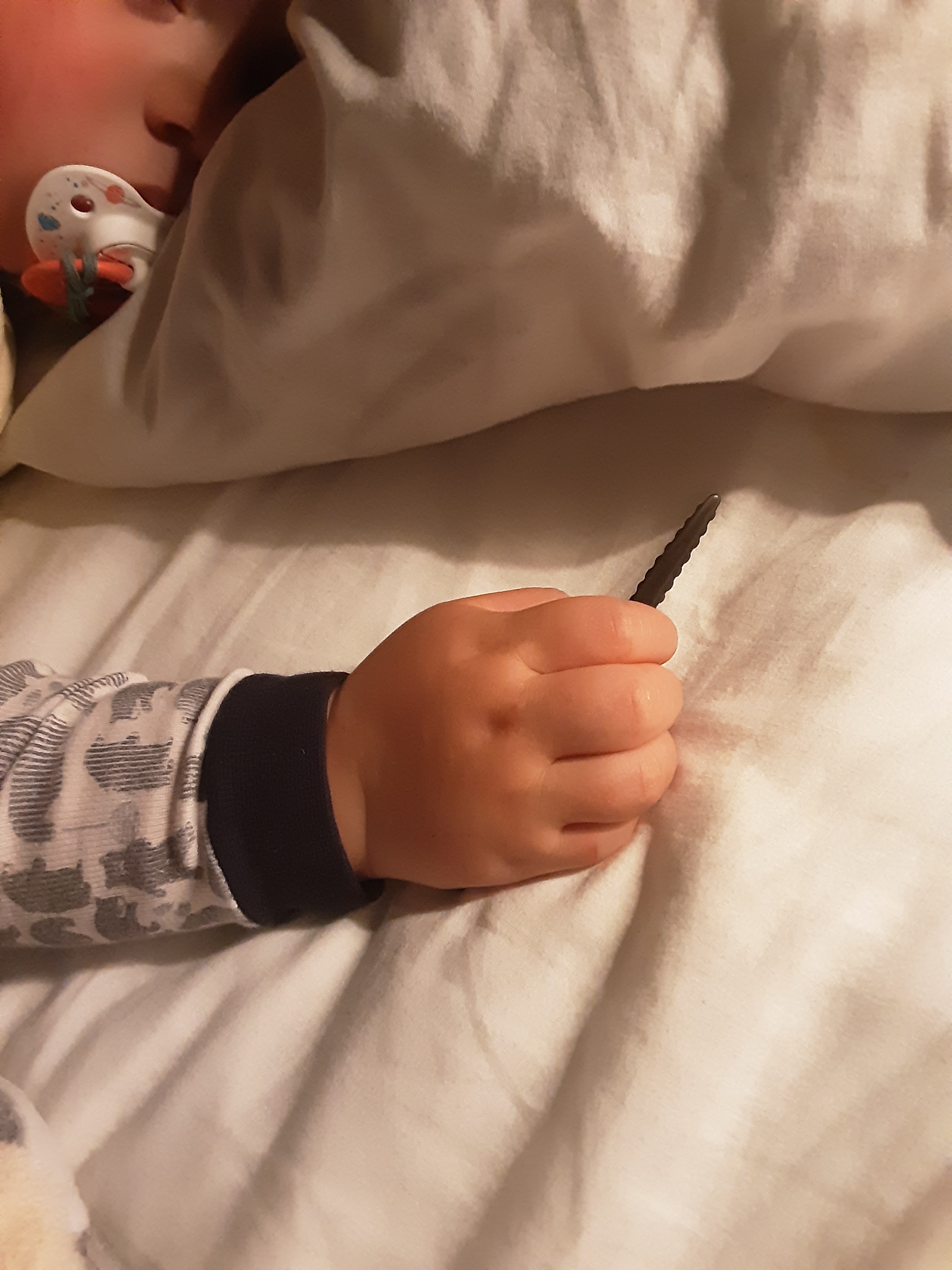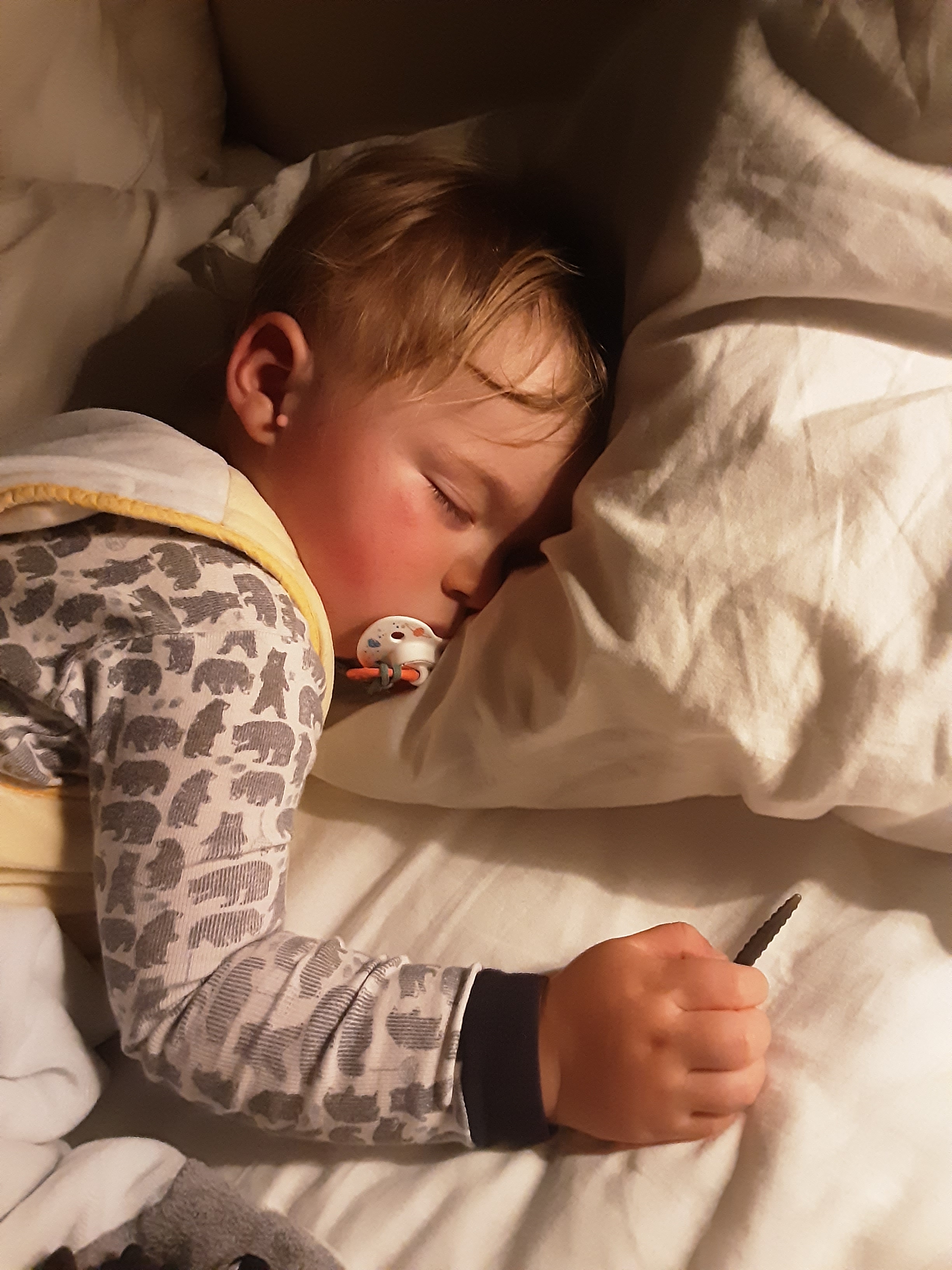 I love when Elliot falls asleep for the night clutching a favorite toy. Here he is with an Imaginext sawtooth shark (he loves fish and anything aquatic).