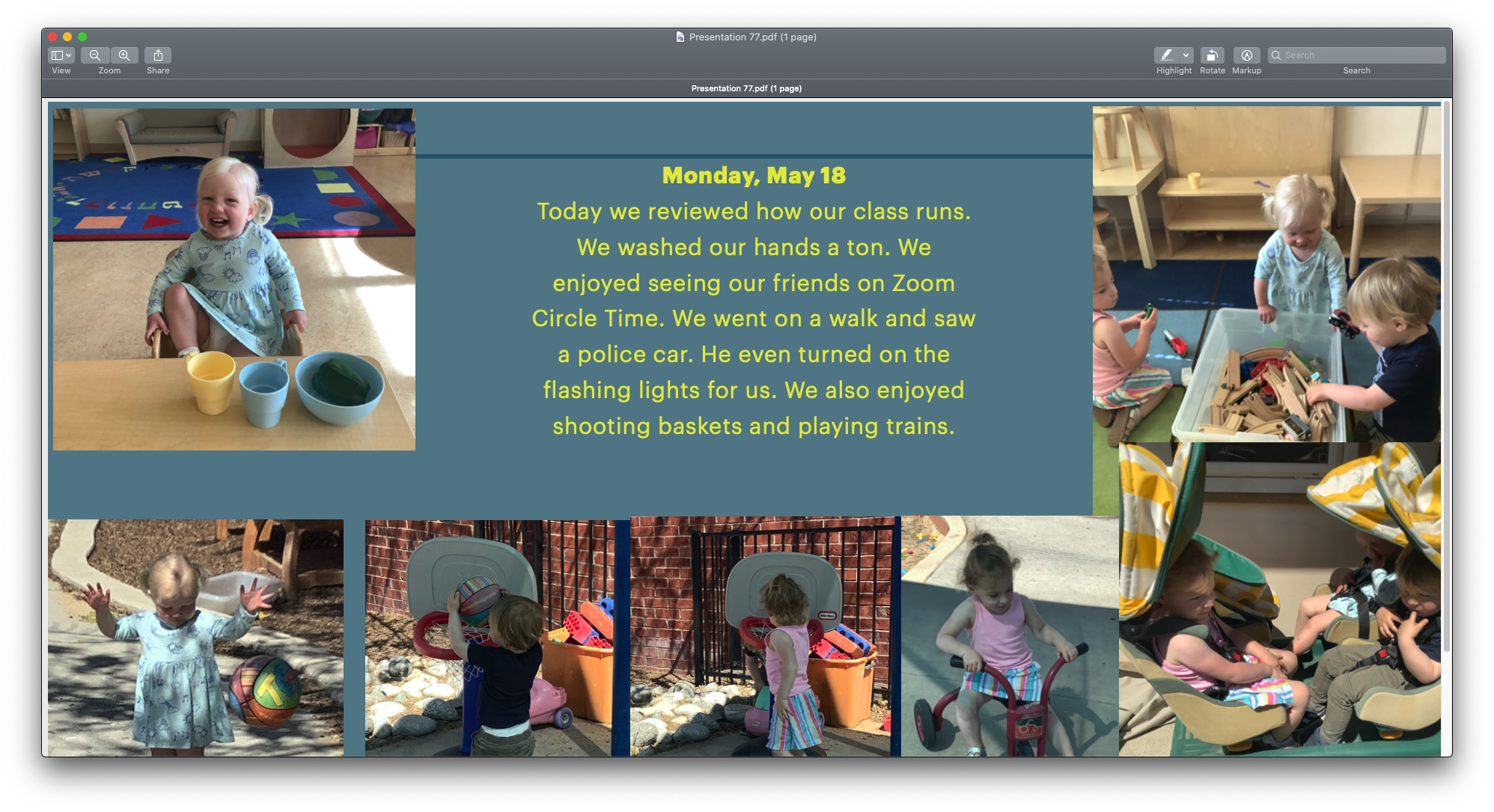 After 2 months at home because of COVID-19, Elliot returned to pre-school yesterday for a shortened day with just 2 other children in Bet class, including his friend since infancy, Olivia.