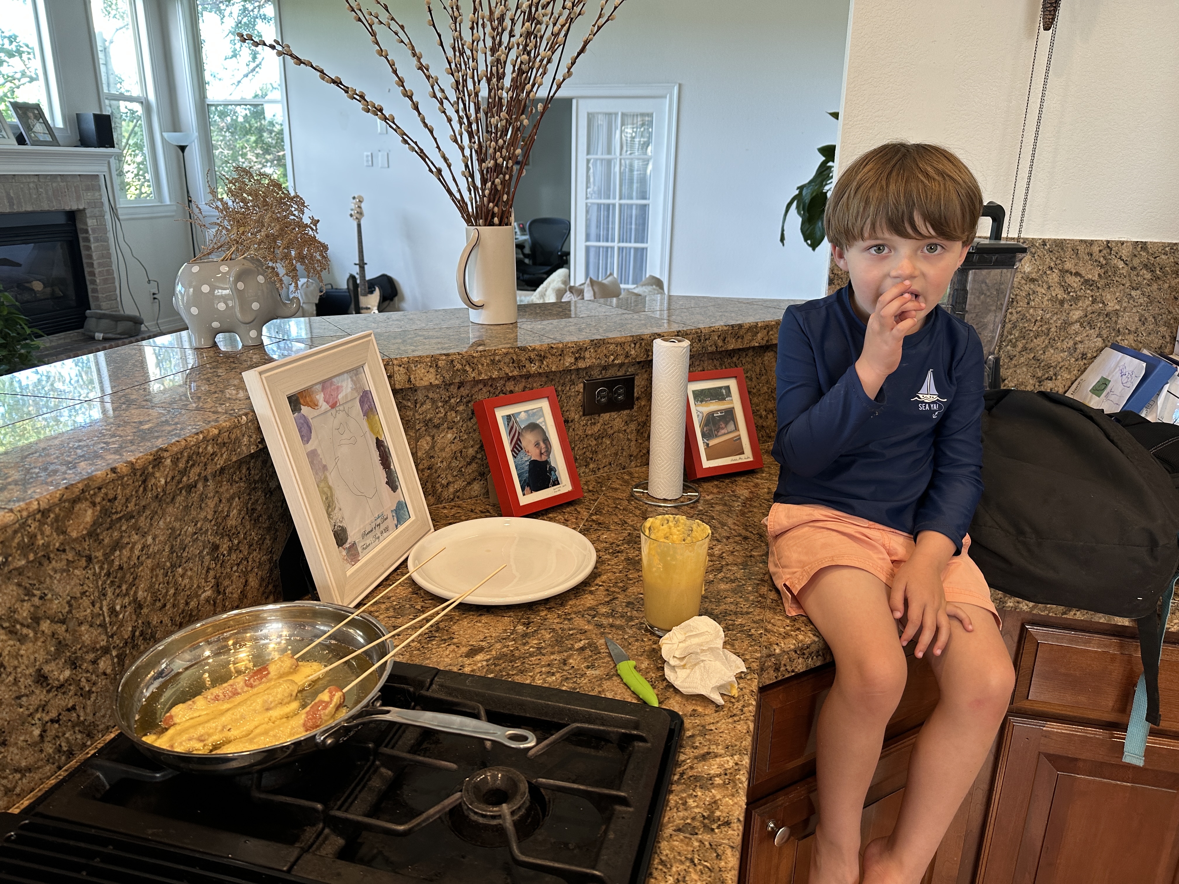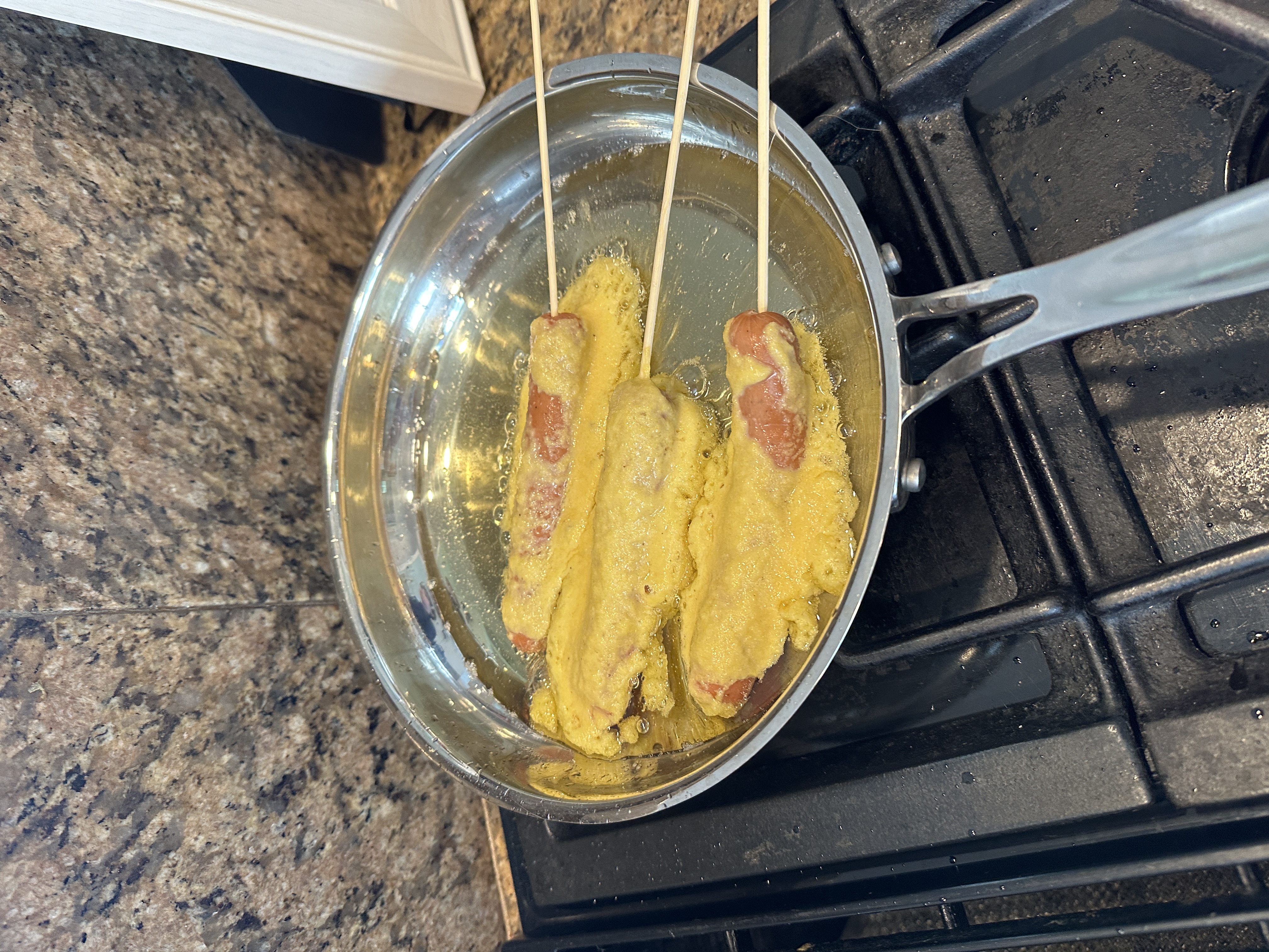Elliot periodically gets obsessed with certain toys or objects of desire. When visiting the Arapahoe and Douglas County Fairs recently, he was obsessed with corn dogs. He wanted to eat a corn dog. When Rebecca Elster said they weren’t kosher (made with buttermilk) and did not buy them for Ella and Maya, Elliot stopped asking until I mentioned we could make kosher corn dogs.