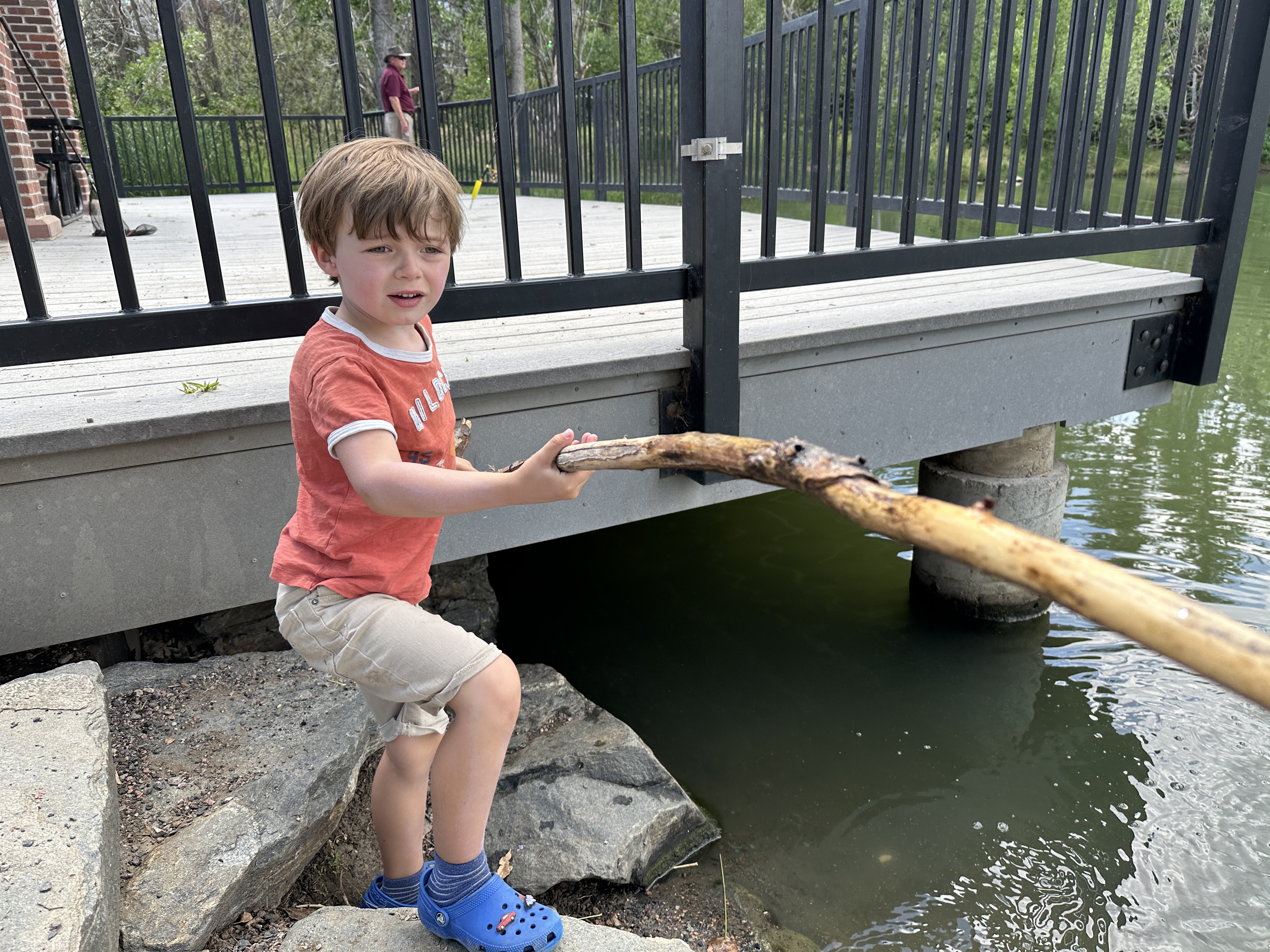 Yesterday and today I visited Elliot at fishing camp. It’s at Flyin’ B Ranch, just a few miles away. I stayed for about 45 minutes – 1 hour. It was a great time with Elliot teaching me how to fish, showing me the toads, telling me about the bull snake from earlier, showing me how the other children were killing grasshoppers. I told him that he knows what is right and what is wrong; and that he can’t control what other people do, but he can control himself.