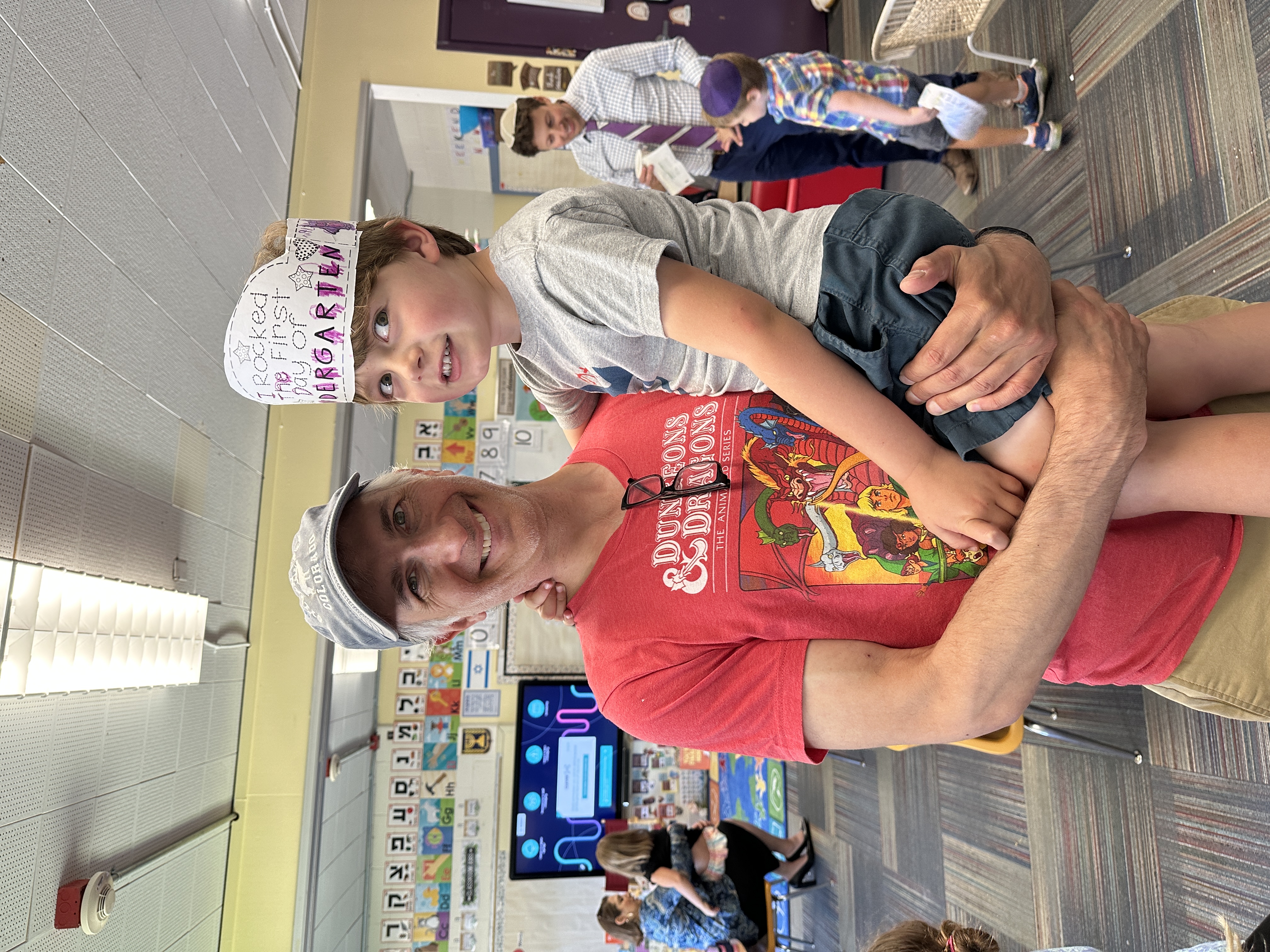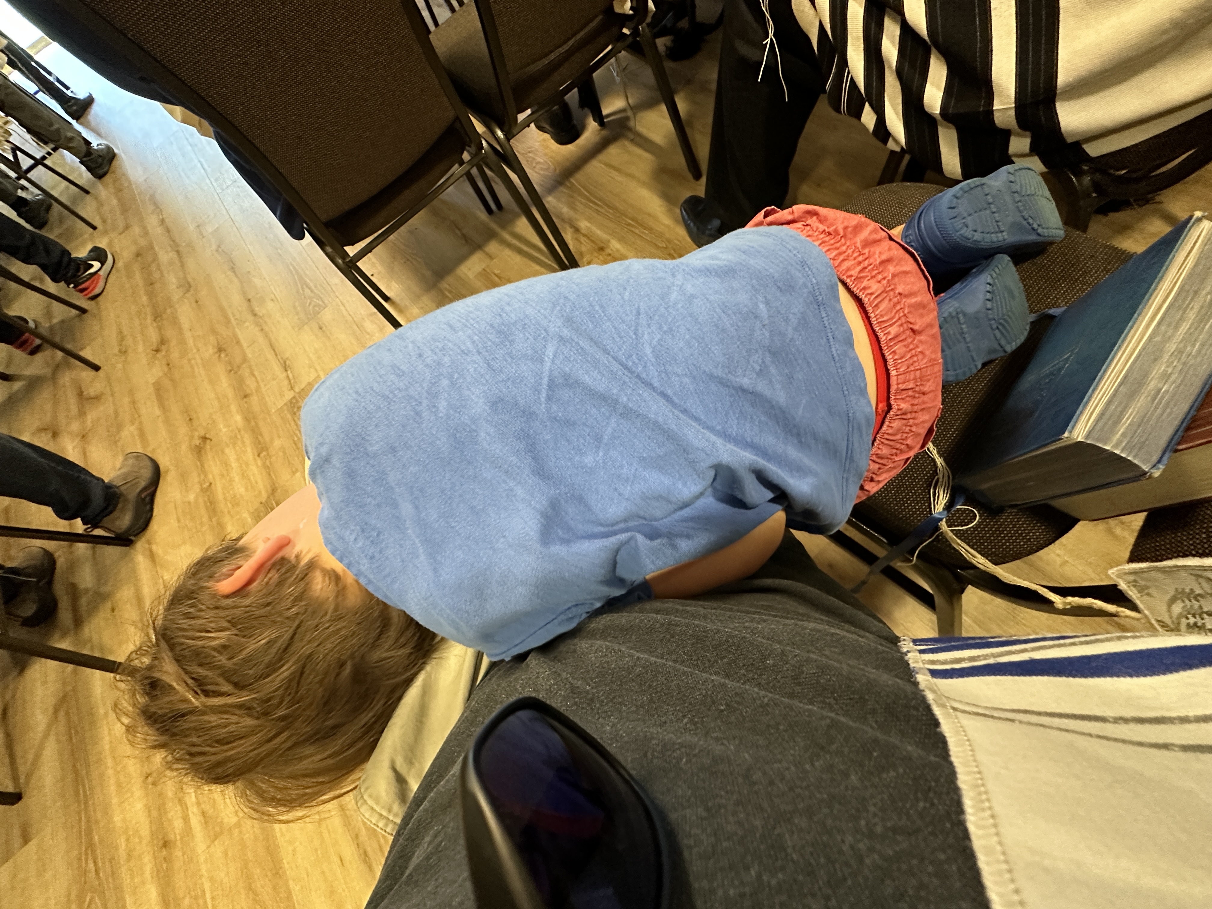 We go to Shabbat Services regularly at Chabad South Metro Denver in Lone Tree. Elliot often falls asleep on my lap before or after he plays with the other children. But now he’s getting too big for that. I’ll miss it. I wish it was not so boring for him. He does get involved, though — he dresses the Torah when it is ready to be put away. I hold him in my arms on the bimah when I am called up for an aliyah. He sings on the bimah with the other children at the end. He sometimes joins Rabbi Meier for his children’s group just when Rabbi Mintz starts his sermon. But he doesn’t really play with the other kids – they are too young or too old. The ones his age are girls.