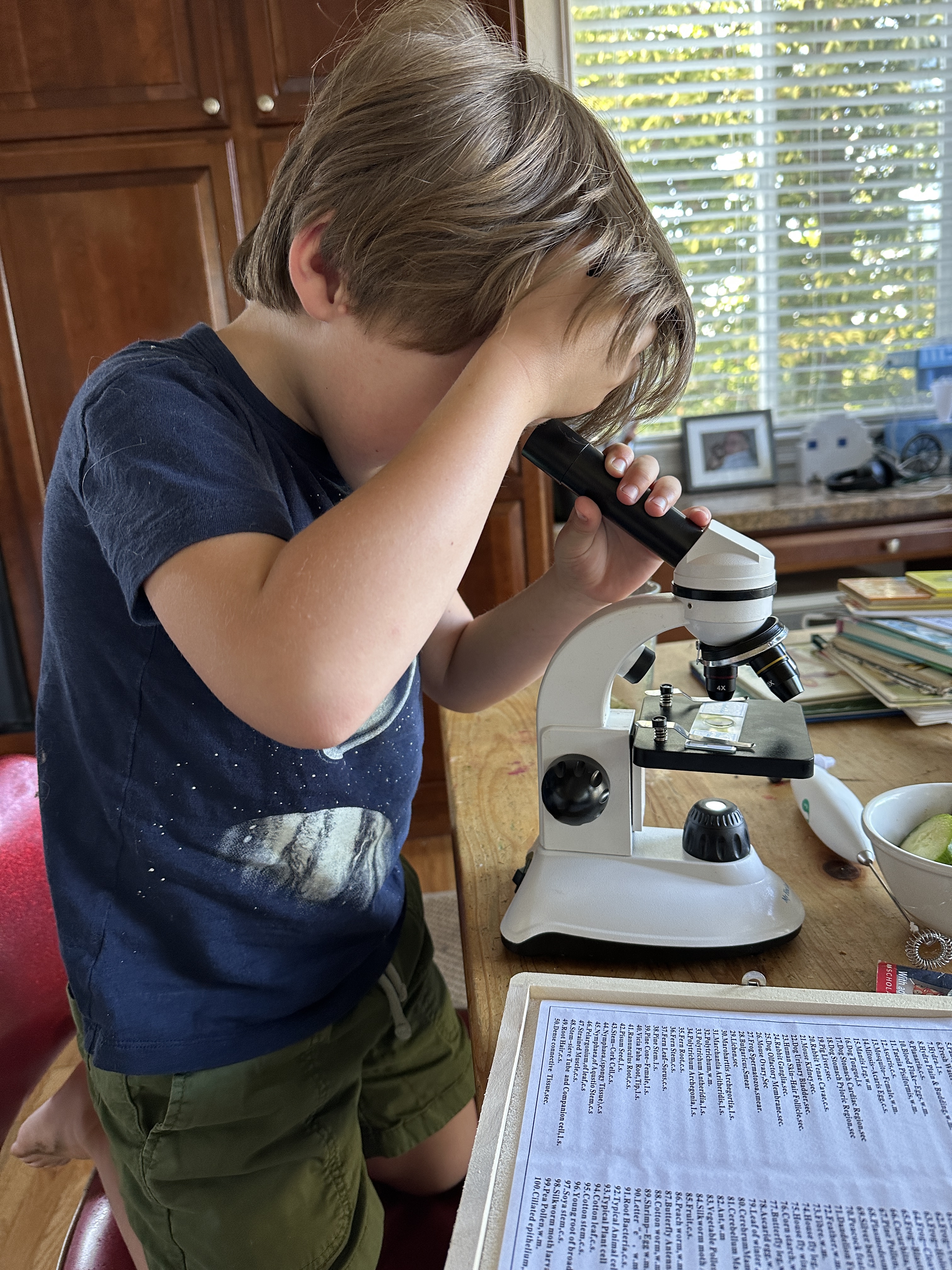 I told him that I love that he loves science. Earlier today before the moon, we looked at 3 new slides in the microscope – mosquito, dog tongue, and dog stomach. There are many more, and I hope he and Naomi look at some on Wednesday.