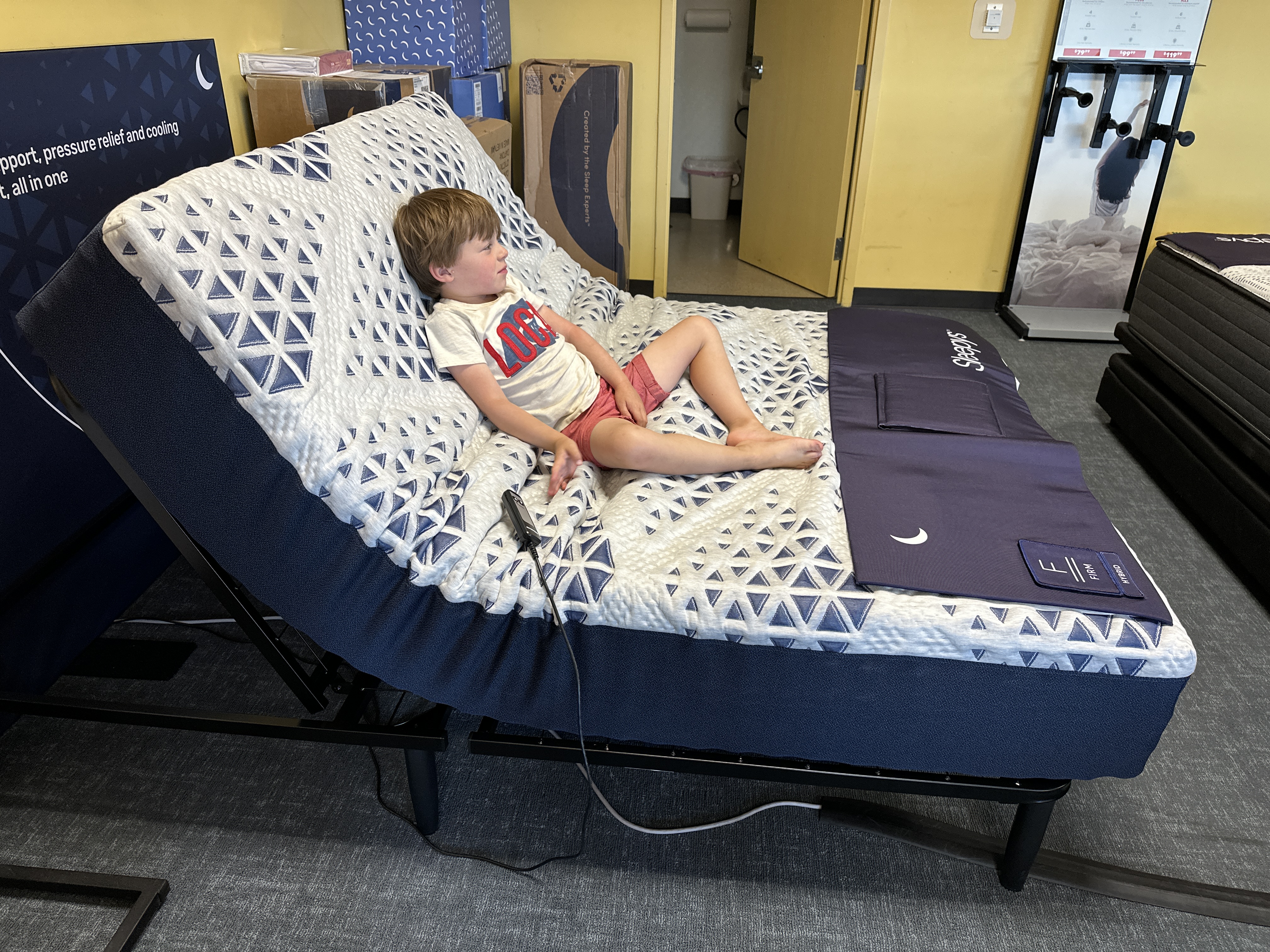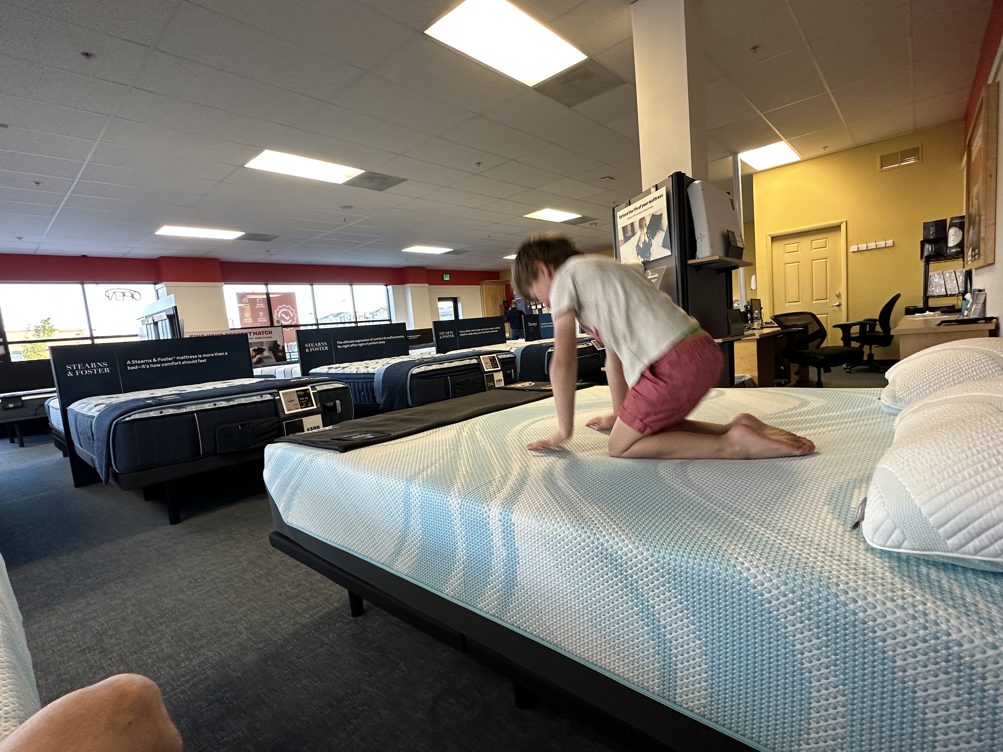 Oh my god, we had so much fun at the mattress store; I didn’t know you could have so much fun at such a place. But Elliot’s never been to one. We tried all of the mattresses, jumping up and down like monkeys and sardines on the beds. Tested all the pillows. No one else was in the store. Elliot’s favorite was the reclining, motorized bed and he begged me to buy it.