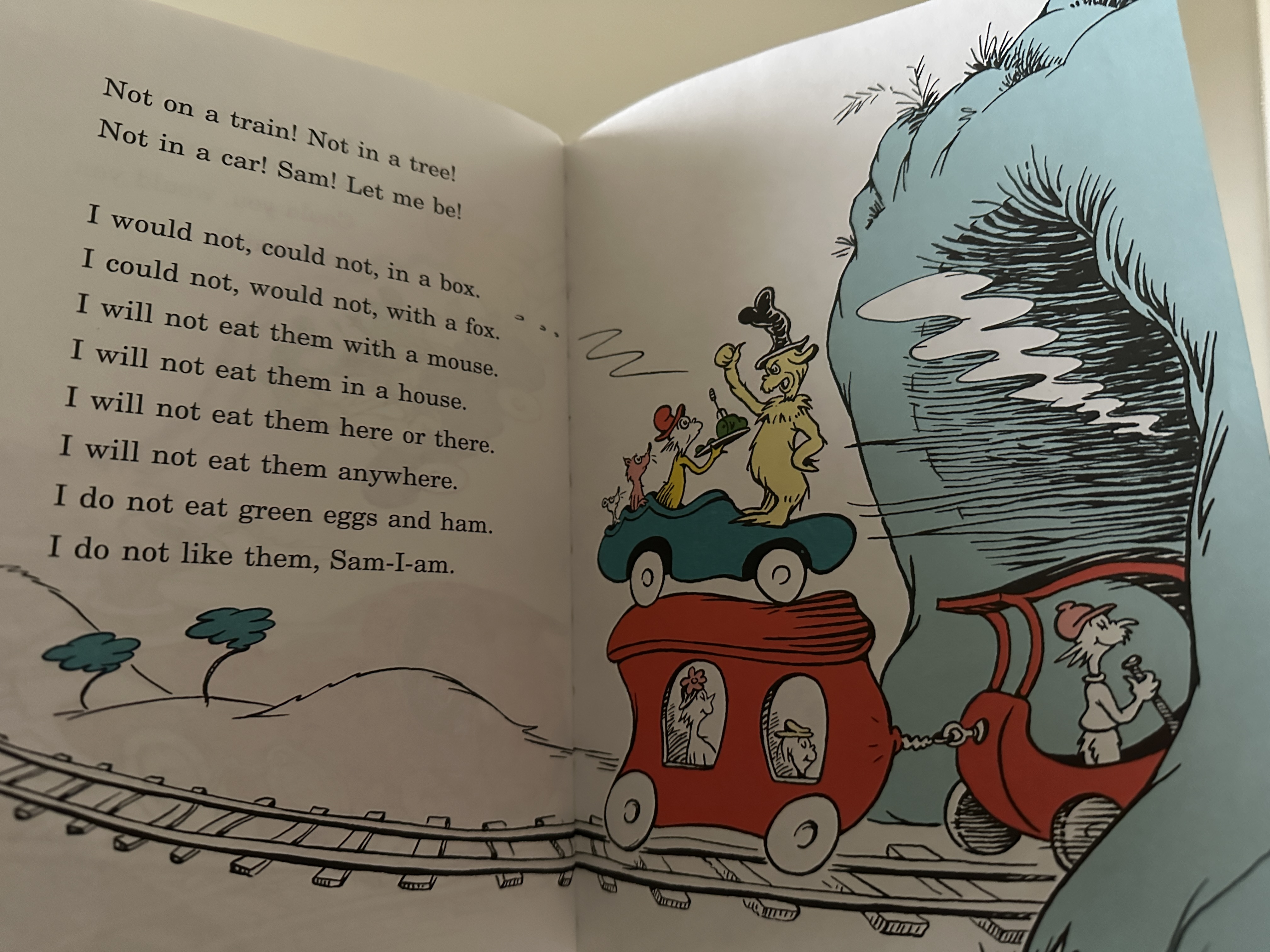 This morning I read the story of Icarus to him and also Atalanta. Then Green Eggs & Ham. Right in the middle, Elliot says “He’s Jewish!” because the Dr. Suess character won’t eat the ham.