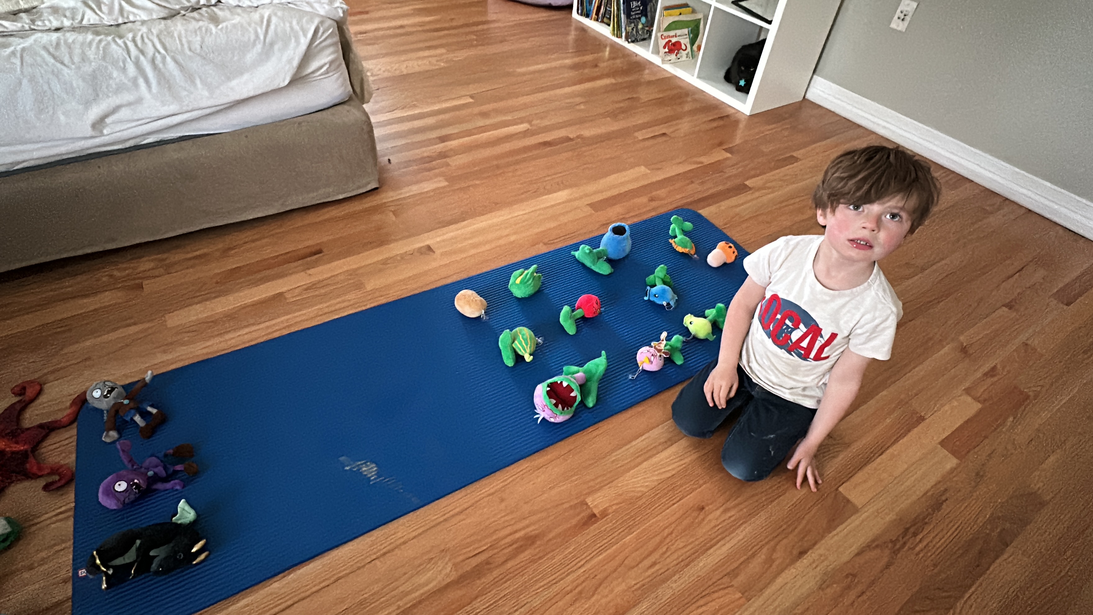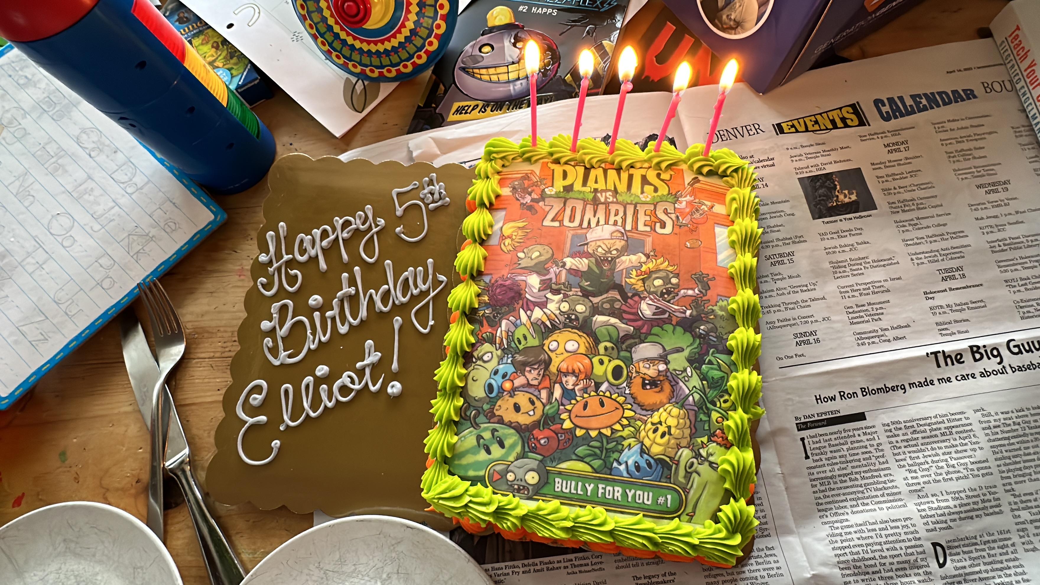 Today we celebrated Elliot’s 5th birthday a few days early. On his actual birthday, he’ll be with Karolina and although there is a bowling party at Bowlero, I wanted something between us. Afterwards, we played Plants Vs. Zombies stuffie classroom “in real life”. I played the Plants Vs. Zombies music and well, it wasn’t a “classroom” – it was just the plants and zombies fighting… especially Elliot’s new “chomper plant”.