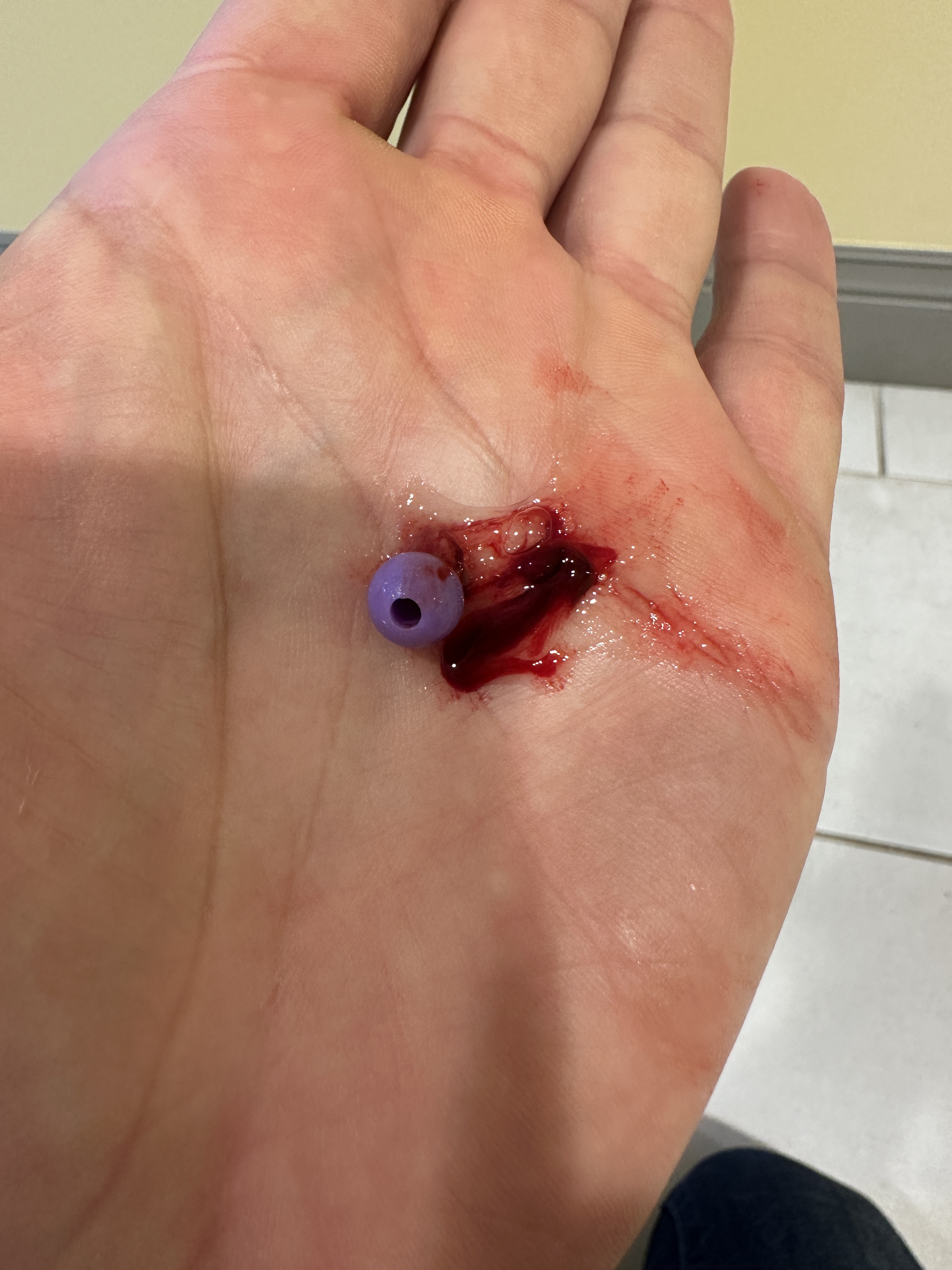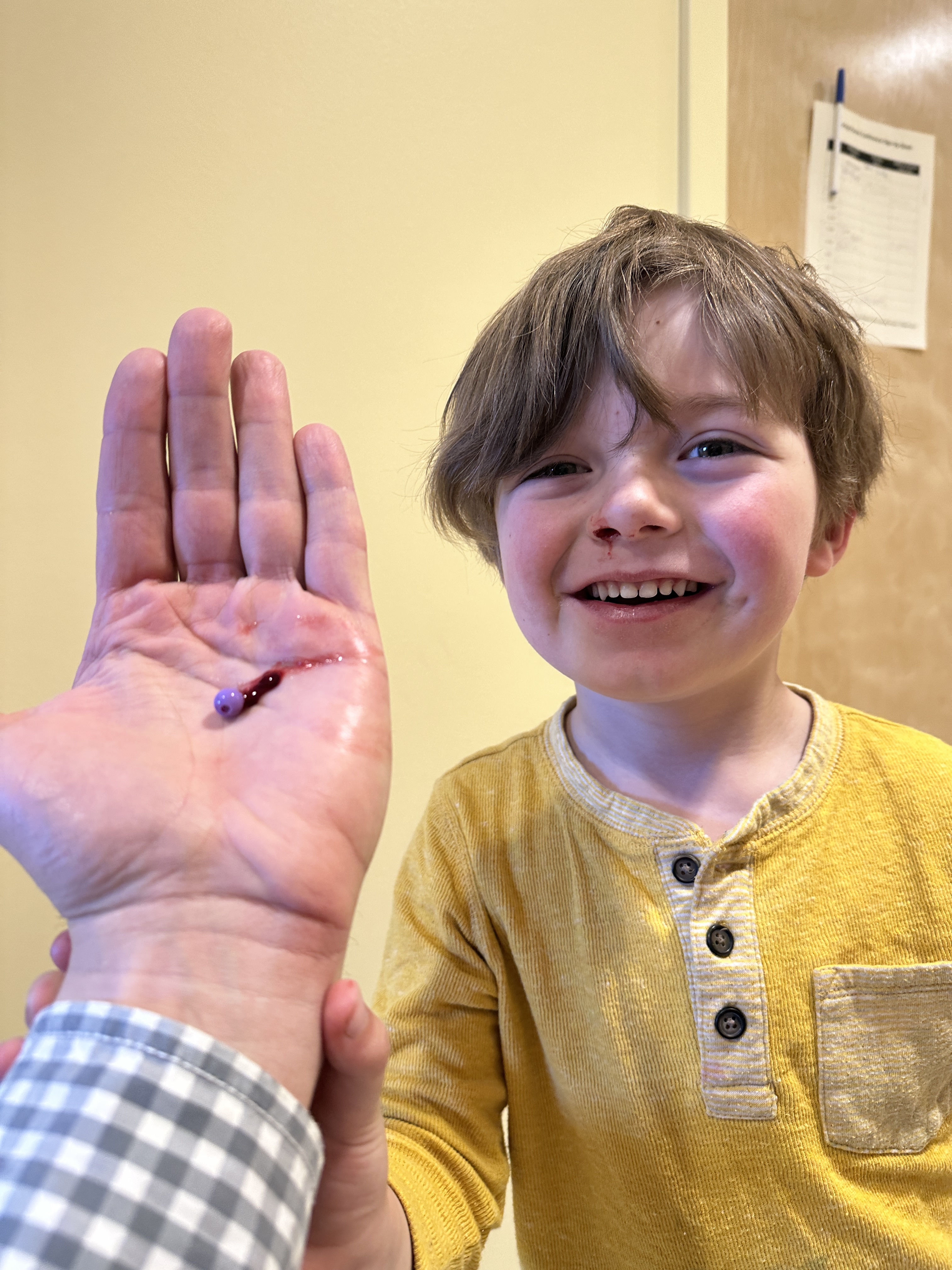 I picked Elliot up from school. His teachers told me he’d been picking his nose so his nose was bleeding. We went into the hallway and Elliot said he had to whisper something to me: