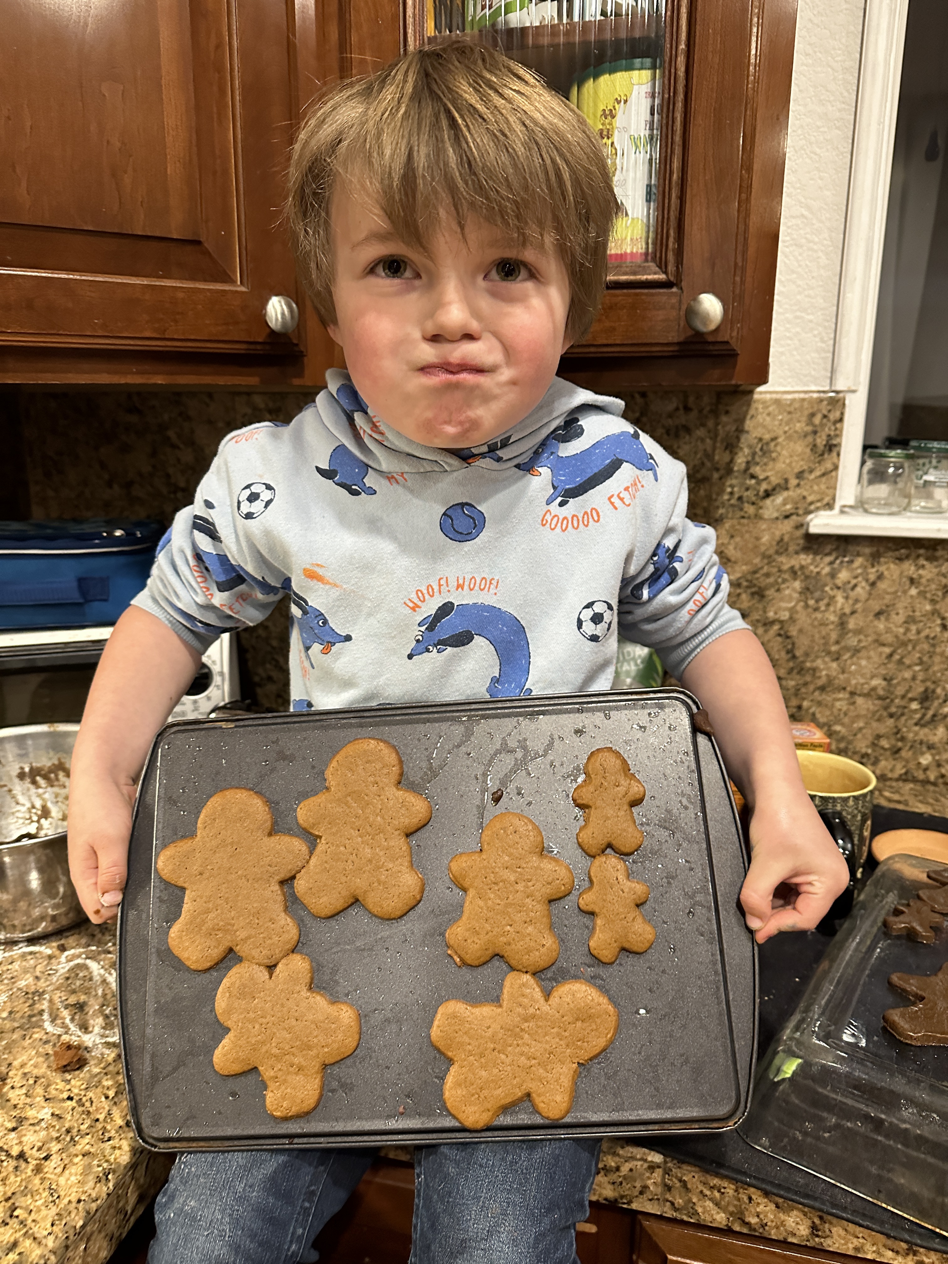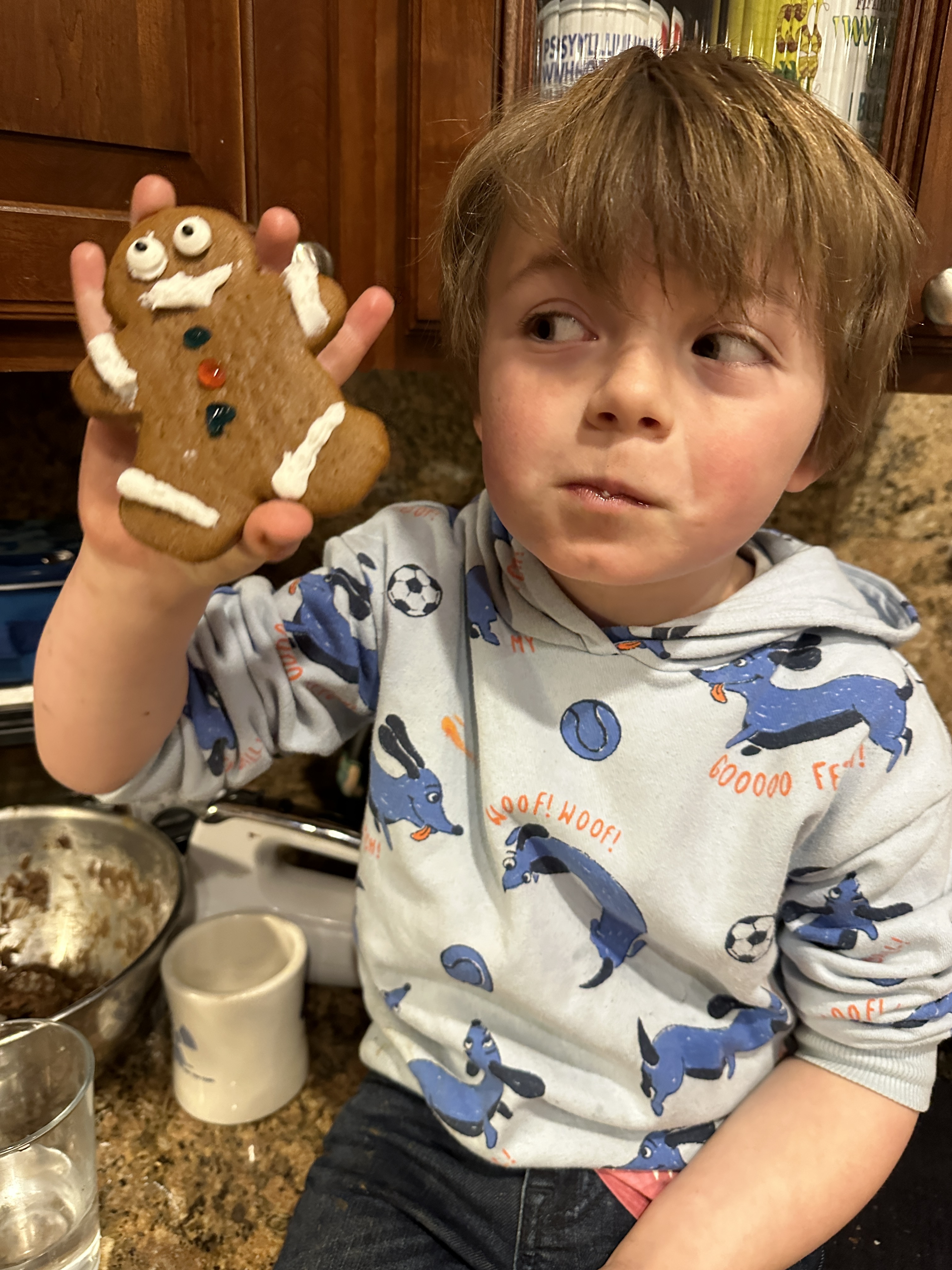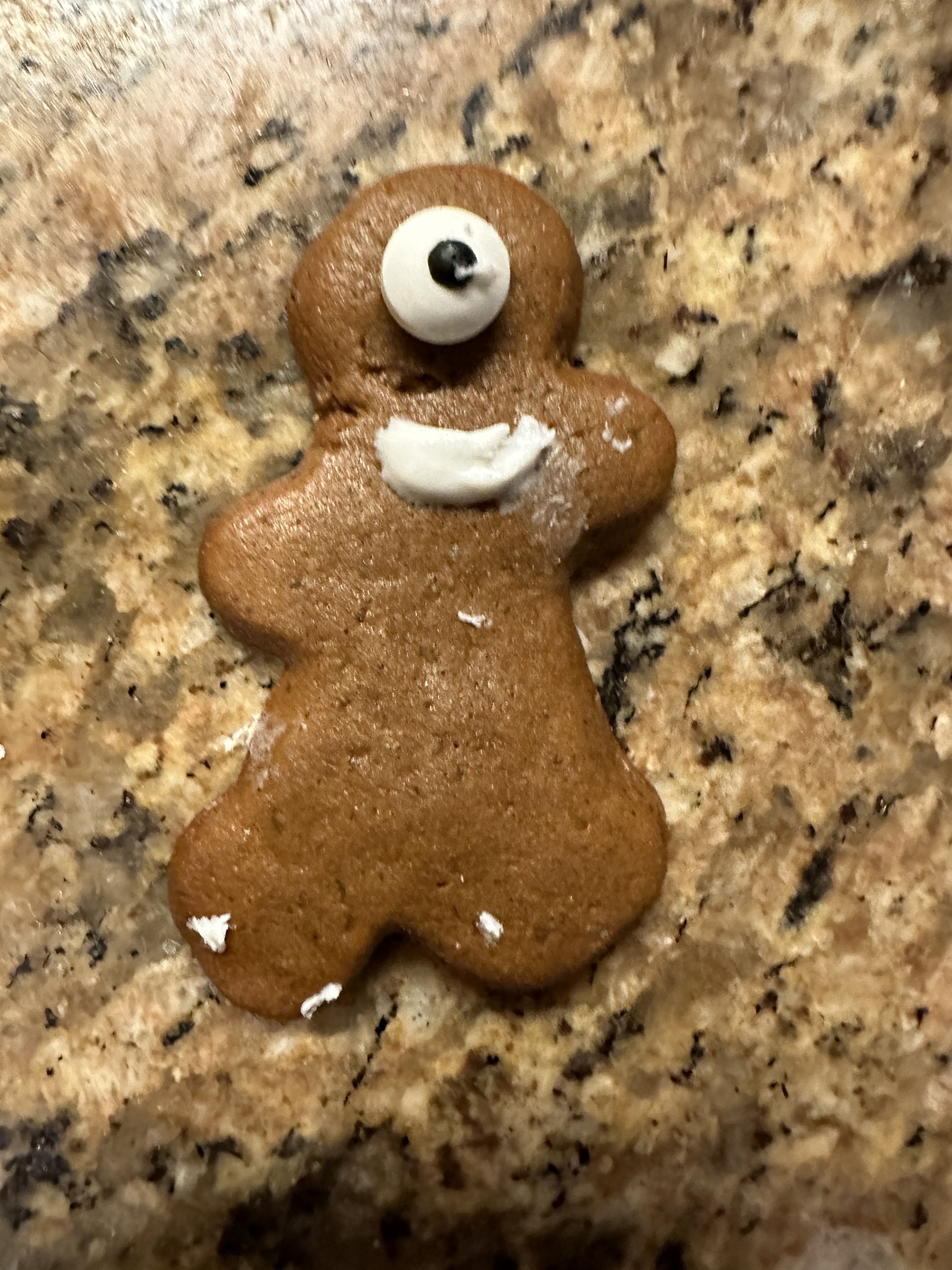 We made gingerbread men from scratch! First time for both of us. Cyclops gingerbread men, too. Or is it a minion?