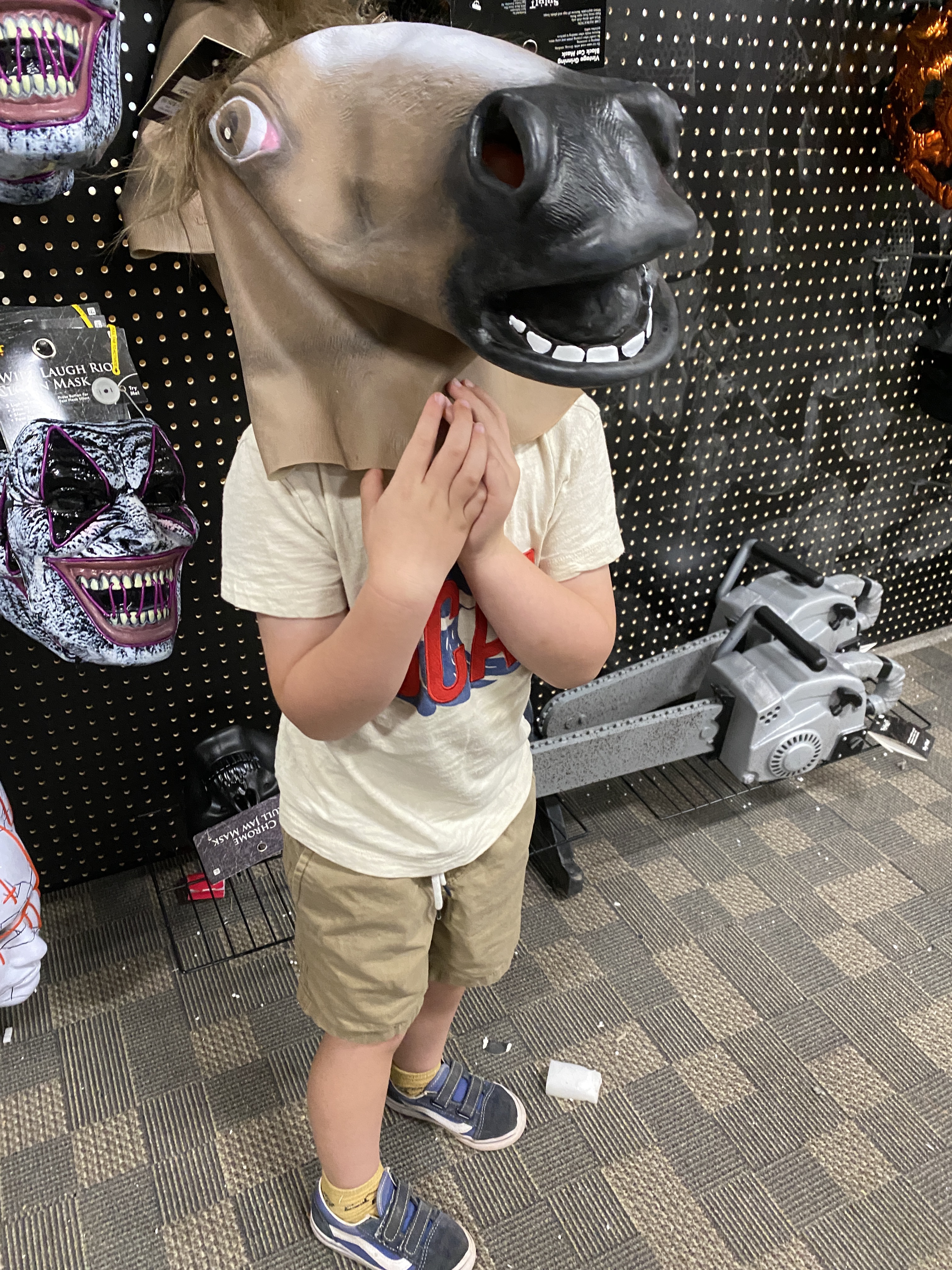 Elliot really wanted this bloody foot attached to a chain. Halloween prop at Spirit Halloween. He got it. At the end of the day, he really wanted a real chain so we got one cut at Home Depot same length. I told him we’re not getting a real foot though. One of these chains is fake and one is real.