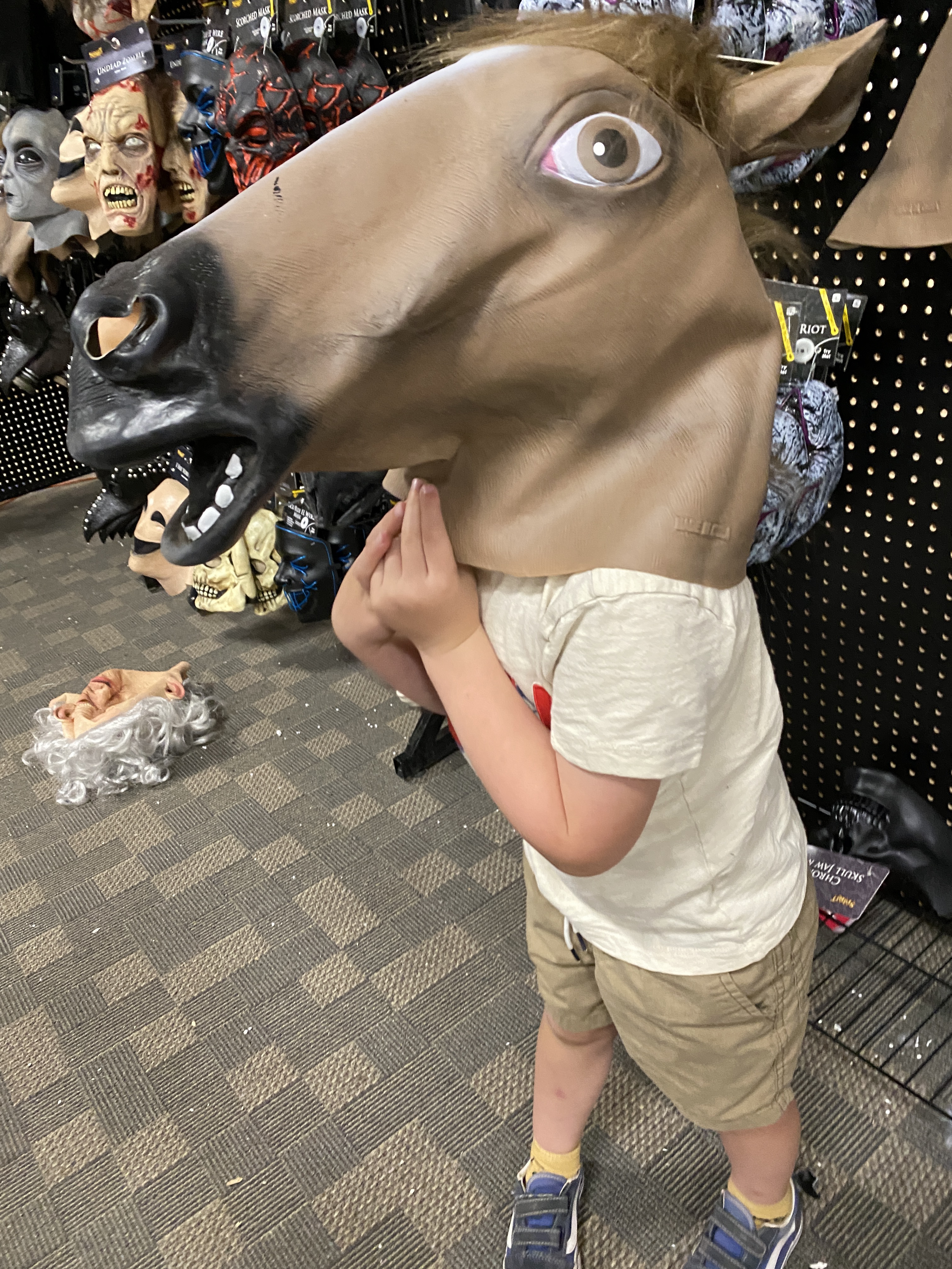 We went to Elliot’s favorite store again, Spirit Halloween. He loves getting scared by the animatronics, looking at the props and costumes, and just browsing around. Here does not ask me to buy everything, but we did get a two-headed snake skeleton.
