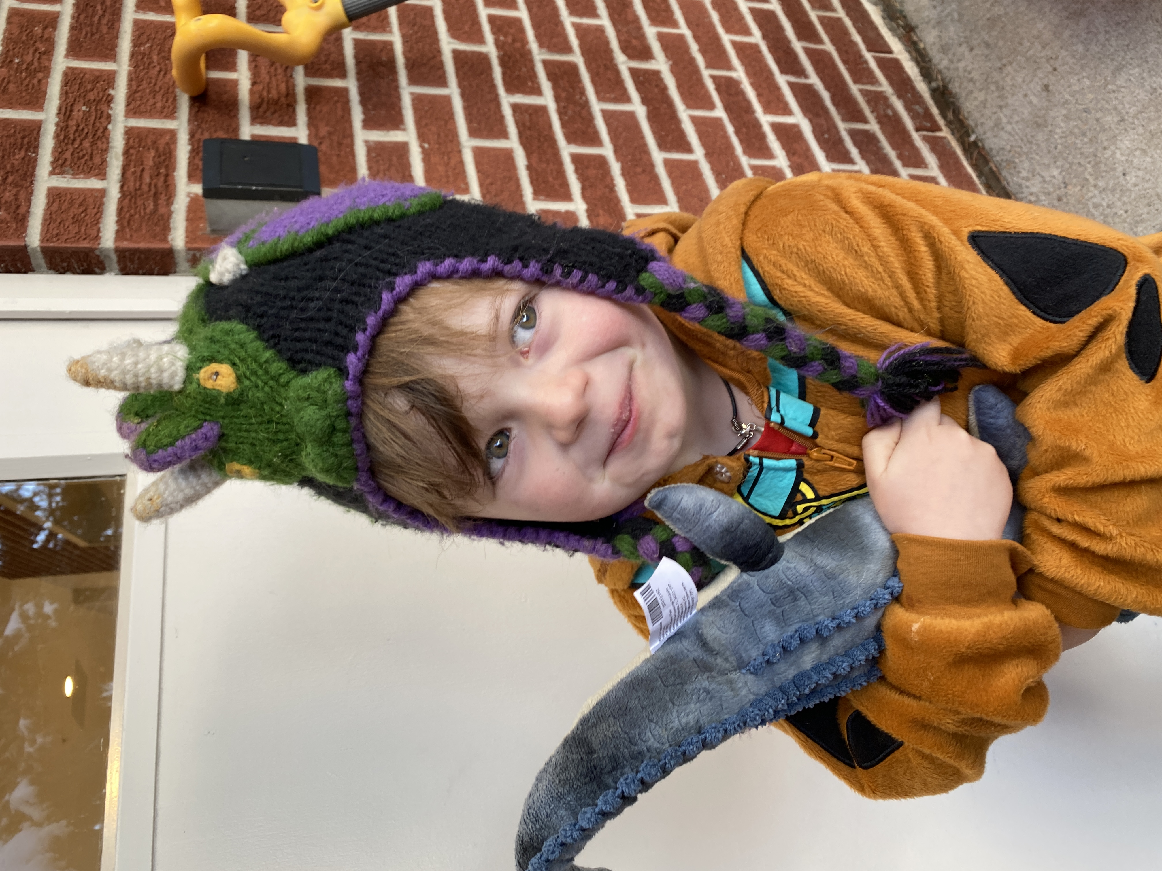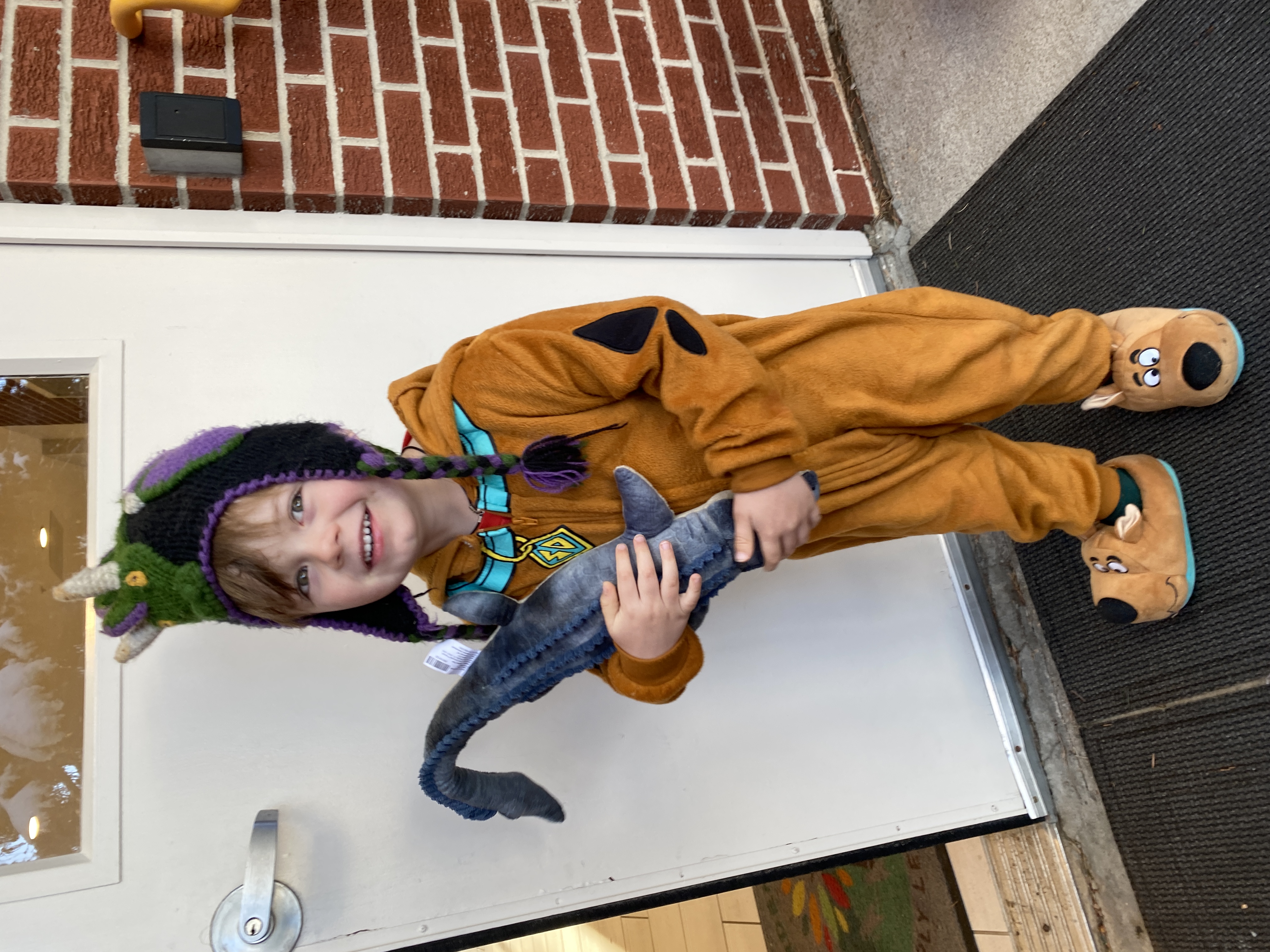 Day After Purim 2022. Wear-pajamas-to-school day. Scooby Doo pajamas with a mosasaur “stuffy”.