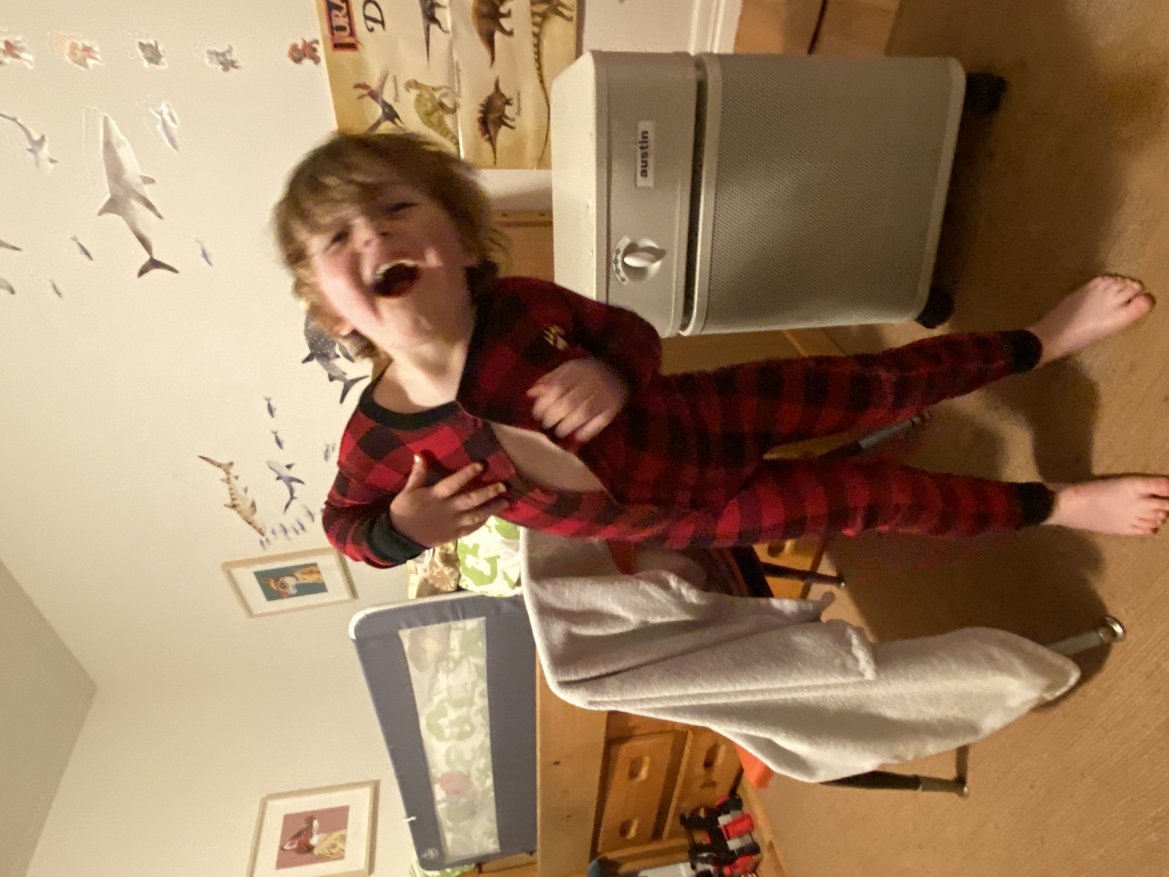 I continue, “Elliot quickly puts on his Huggie Wuggie costume to become HUGGIE WUGGIE, THE SUPER HERO. What is Huggie Wuggie’s super power?”