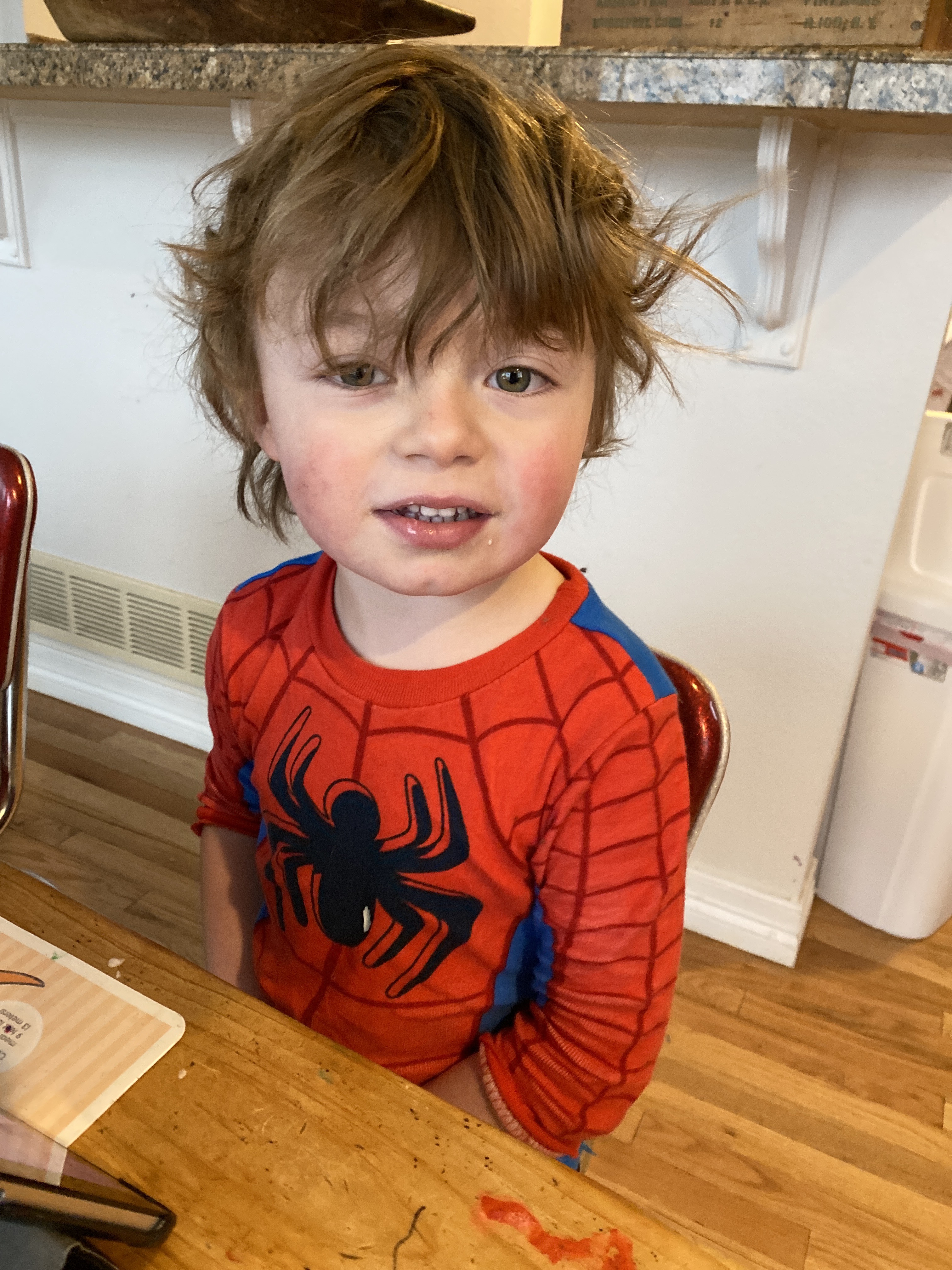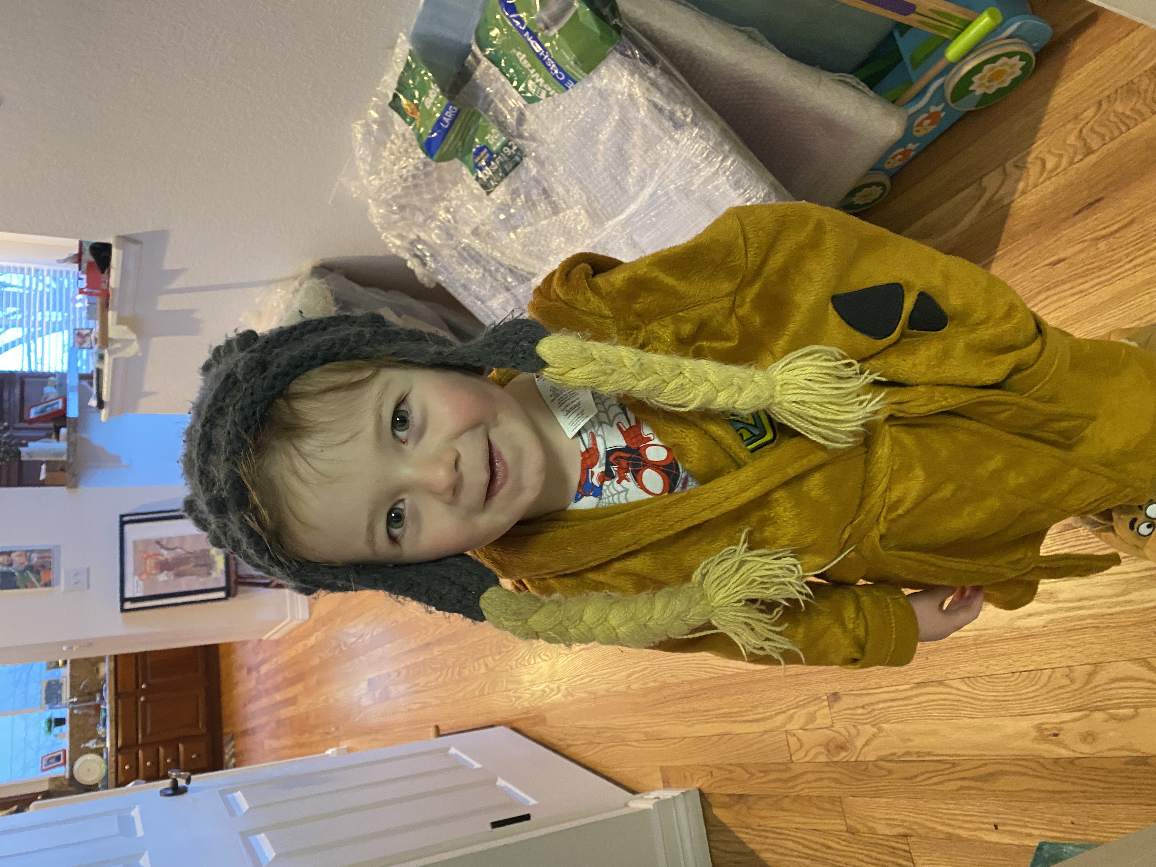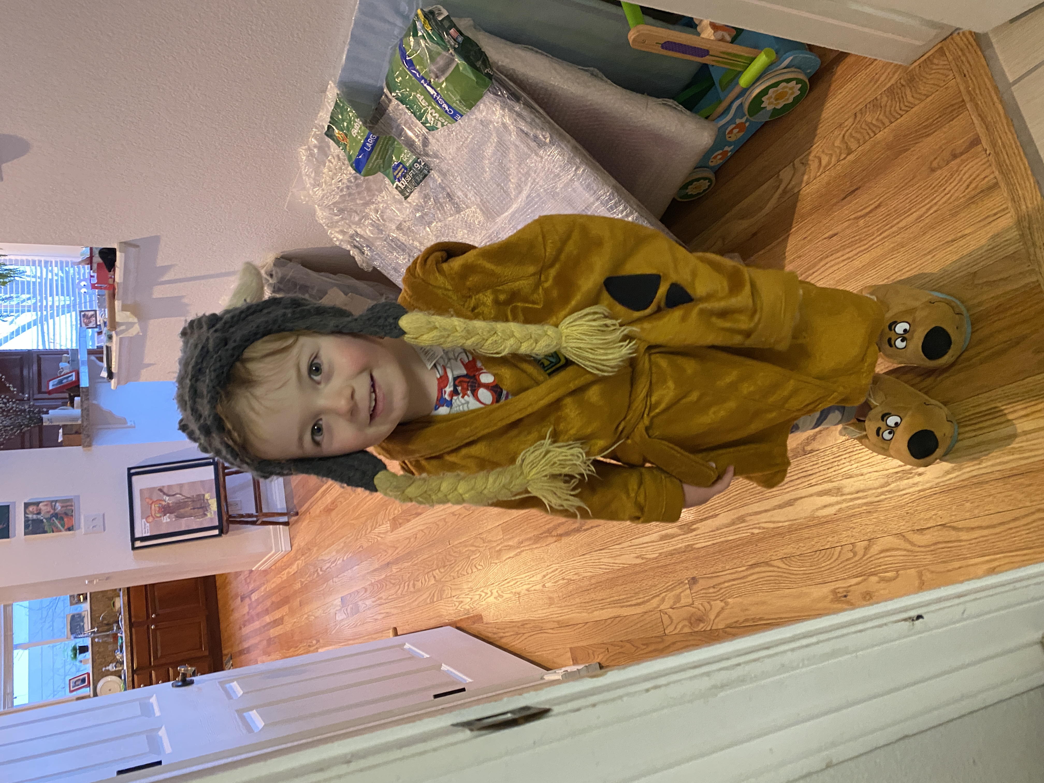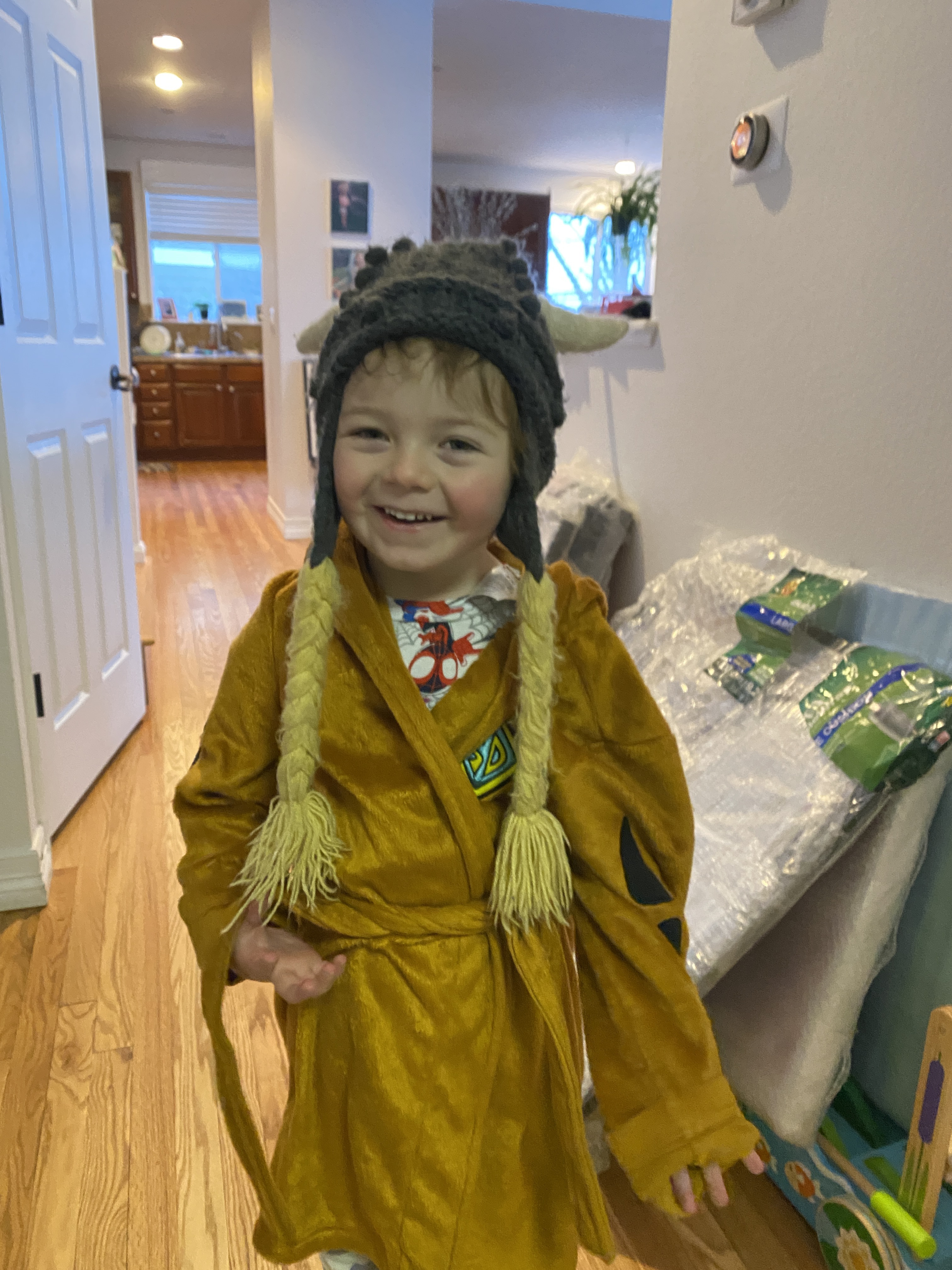 He apologized and said he peed. I thought he had peed in his bed — which has not happened yet! (He’s been fully toilet trained since sometime in July or August). We went to his bed. I searched his sheets but nothing was wet. When i touched him, though, his pajamas were wet. It turned out he peed on the floor, through his pajamas, next to my bed waiting for me to wake up!
