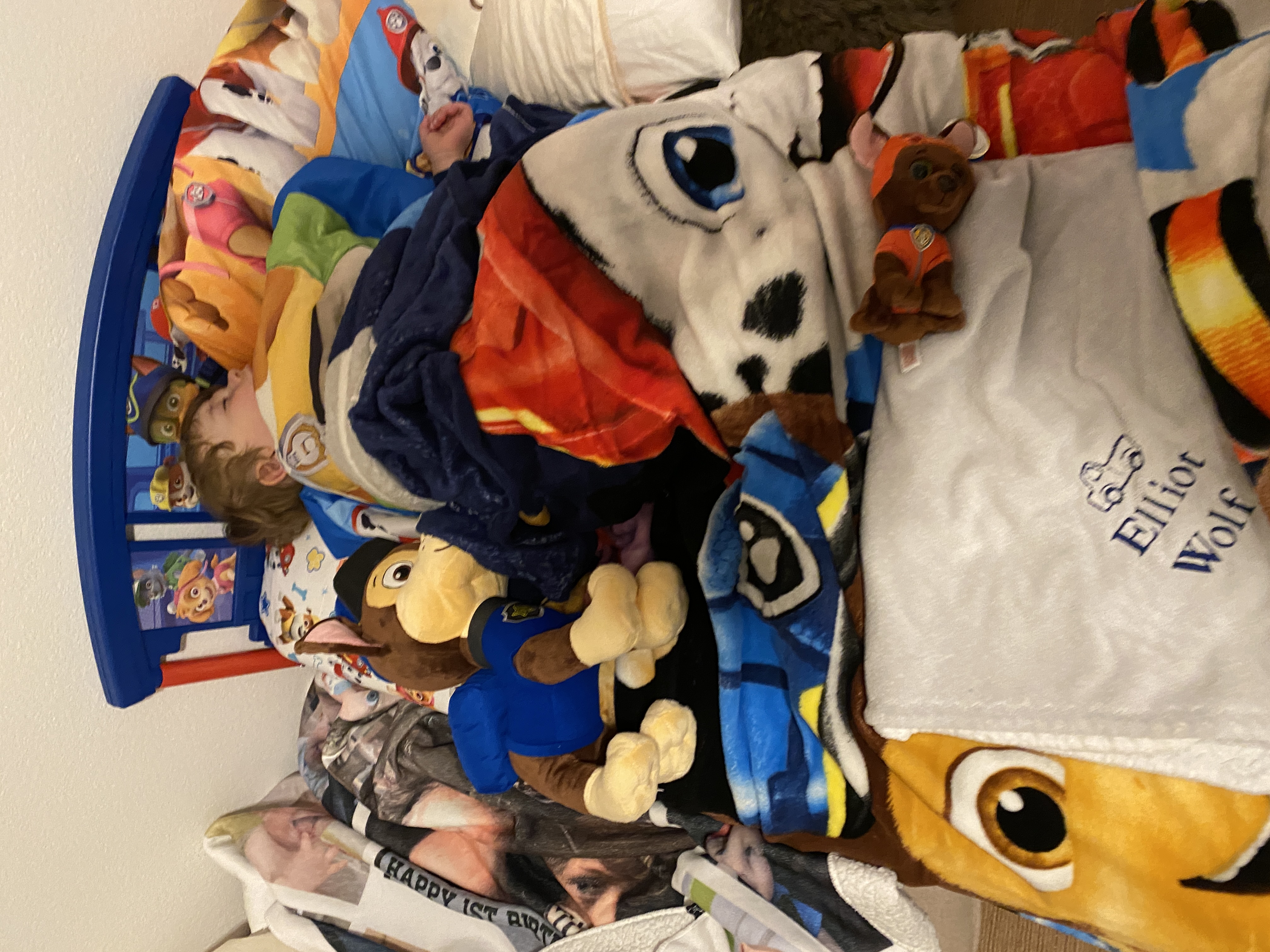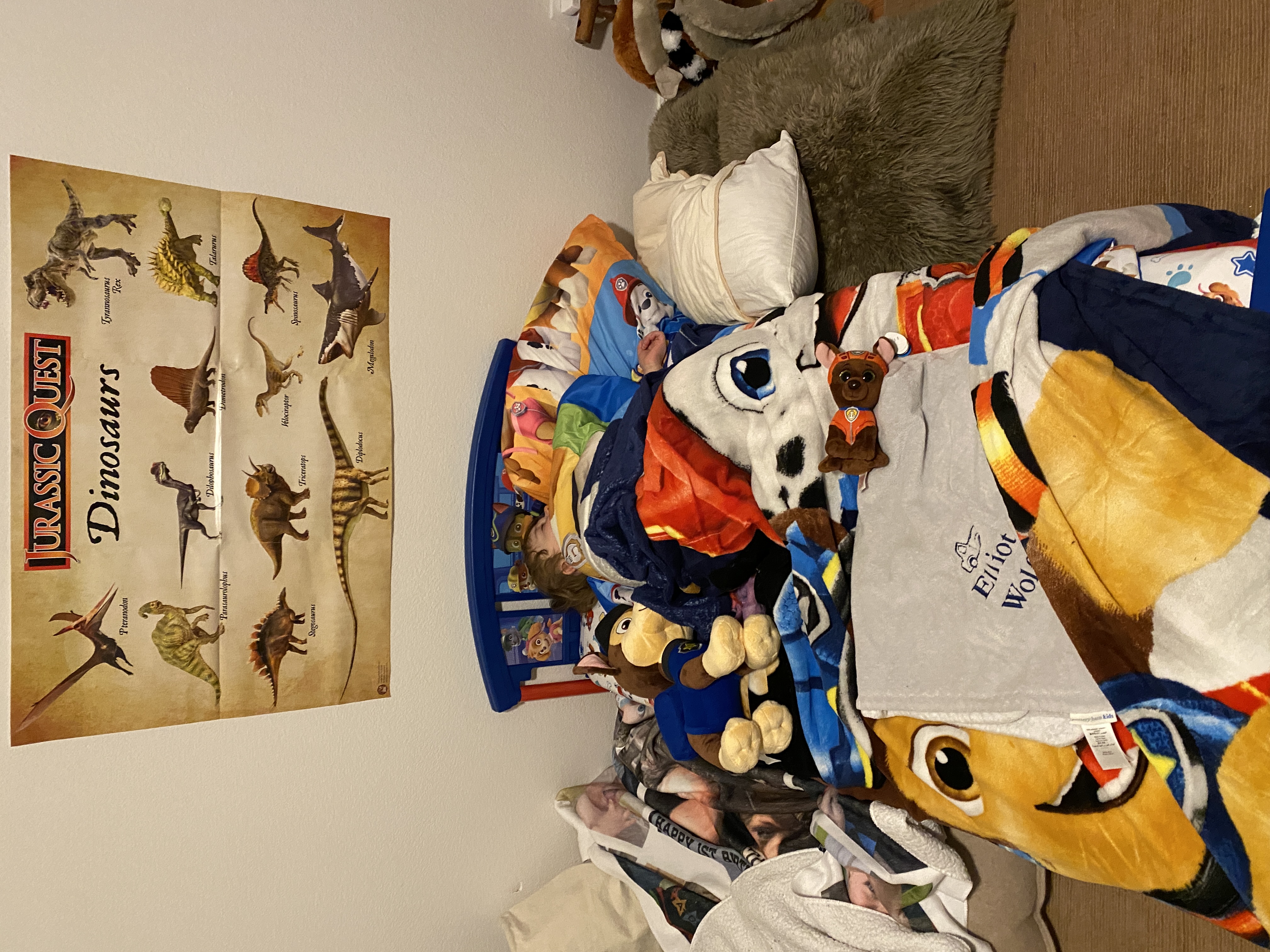 It was a rough night, but Elliot did better than I expected. He was exhausted after several hours at the Arapahoe County Fair. He fell asleep fast even after the excitement of seeing his new bed, blanket, sheets, pillow, and “Chase” stuffy. I lined both sides of the bed with throw pillows in case he fell out of bed in the night. I had to sleep next to him on the floor. It was about 9:30, an hour later than usual.