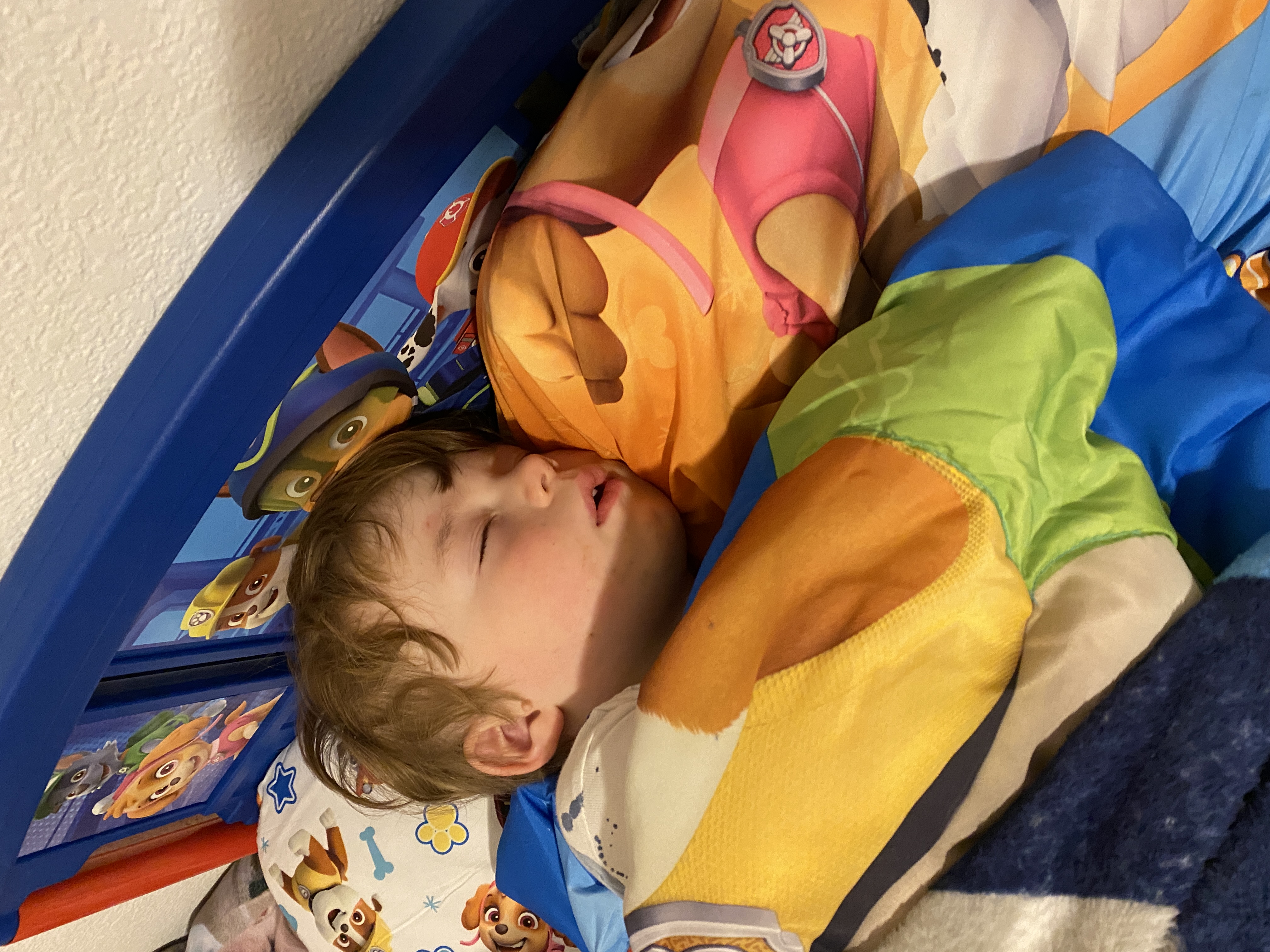 He woke up once more towards morning. I went to him, carried him with his Paw Patrol pillow and blanket to my bed, and we fell asleep together for another hour or two. We woke up two hours later than usual.