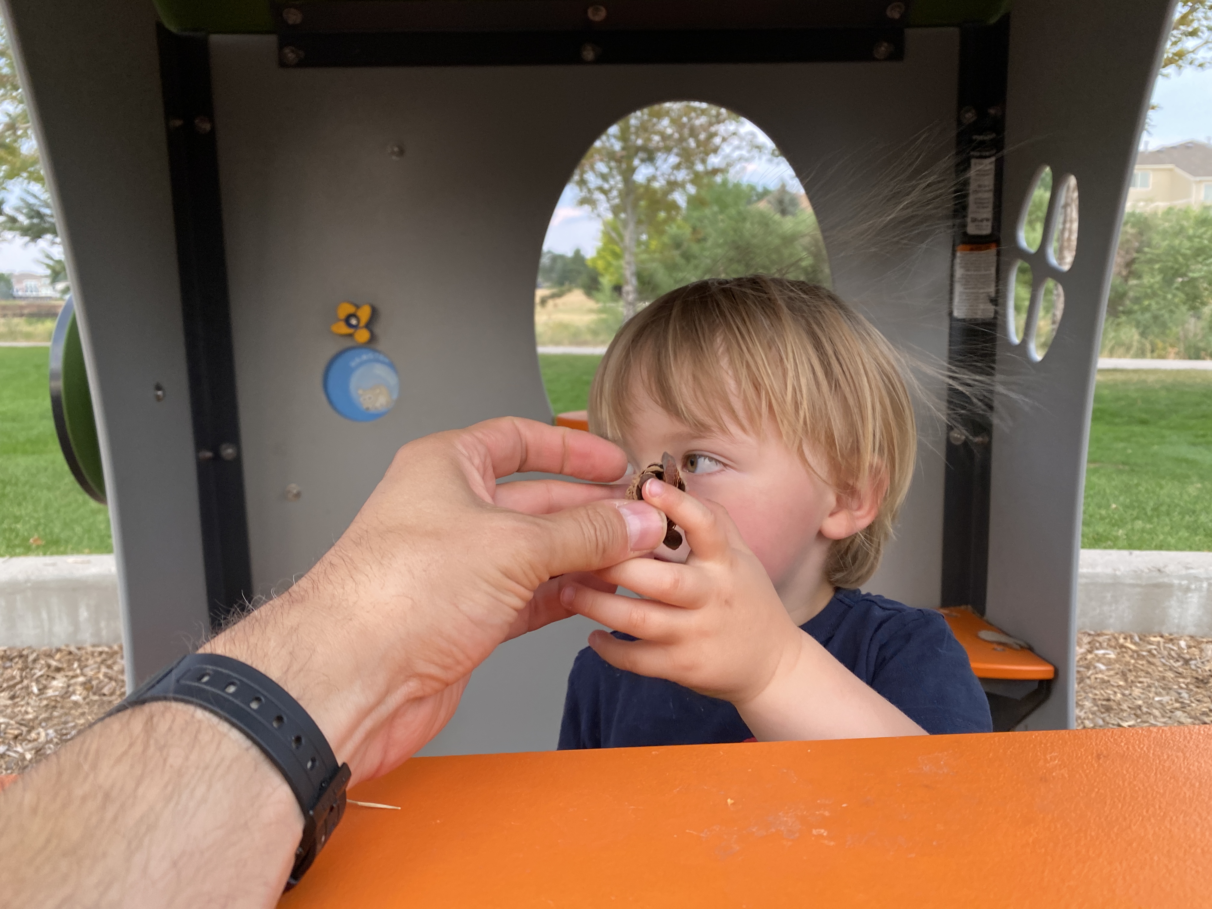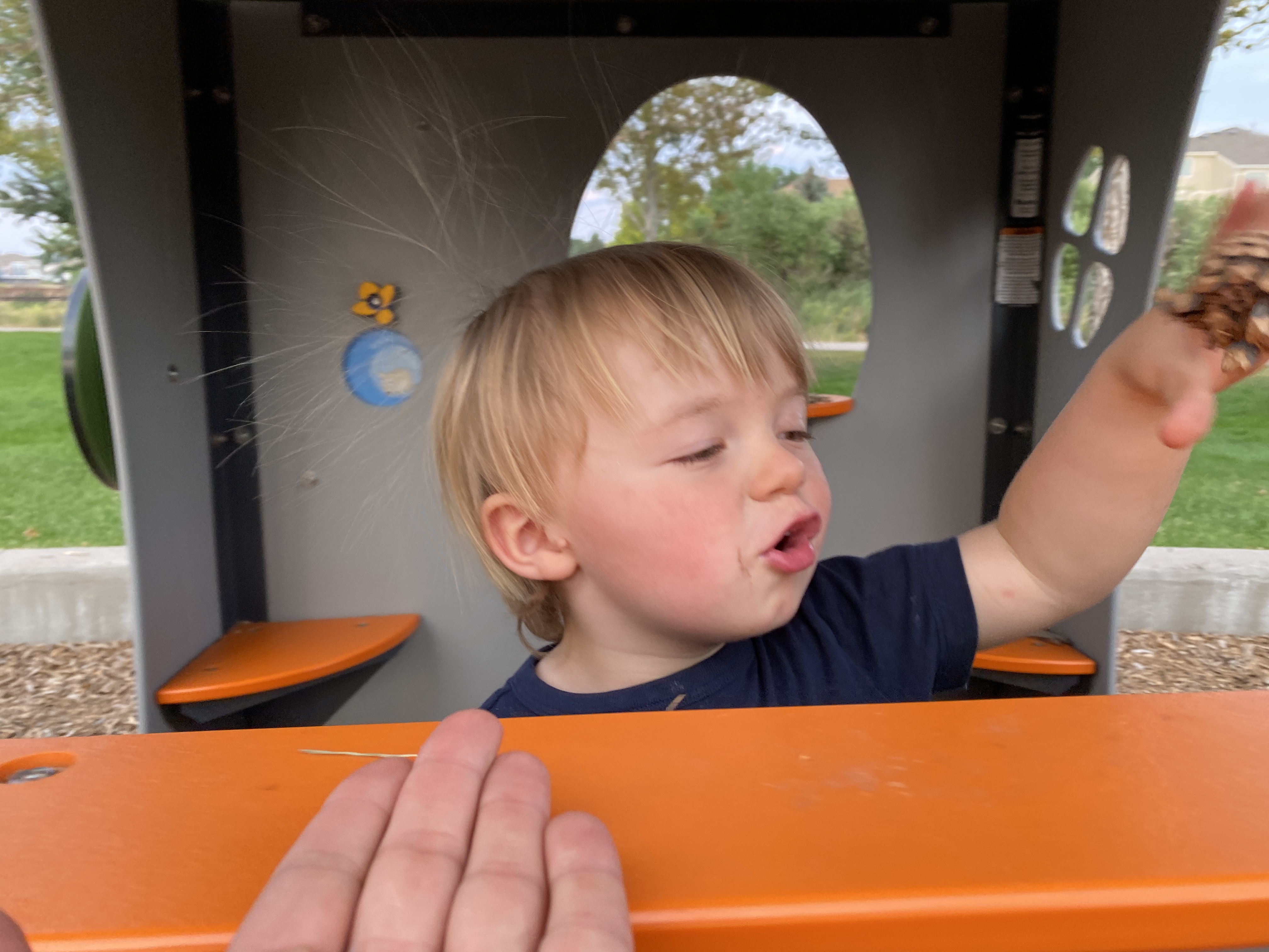 Today at the playground he held out a pine cone to me and said “pine cone?” quite clearly! Loved it. I asked him to hand me the pine cone and he threw it at me 🙂