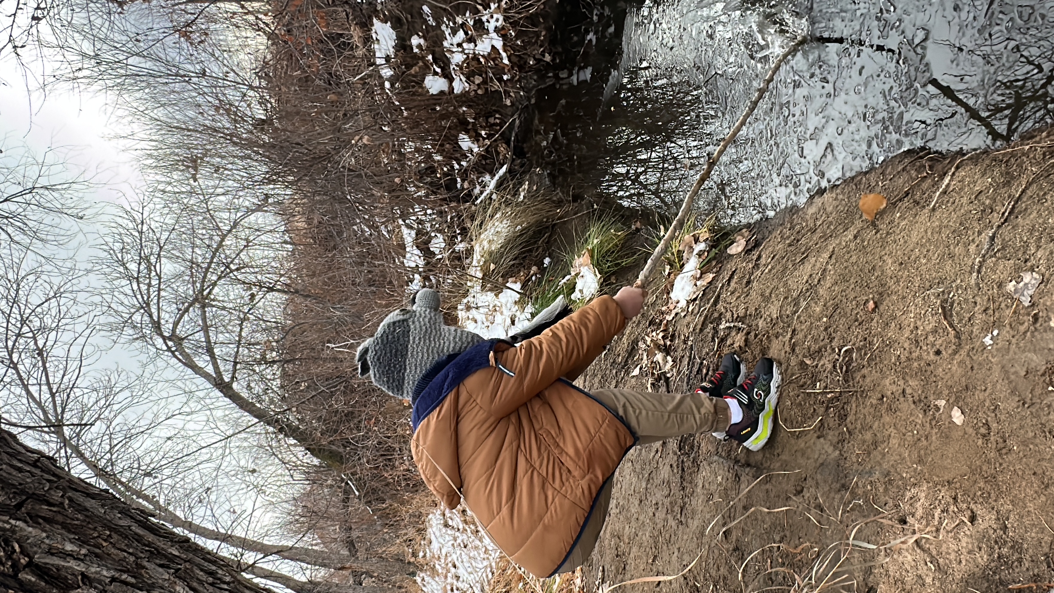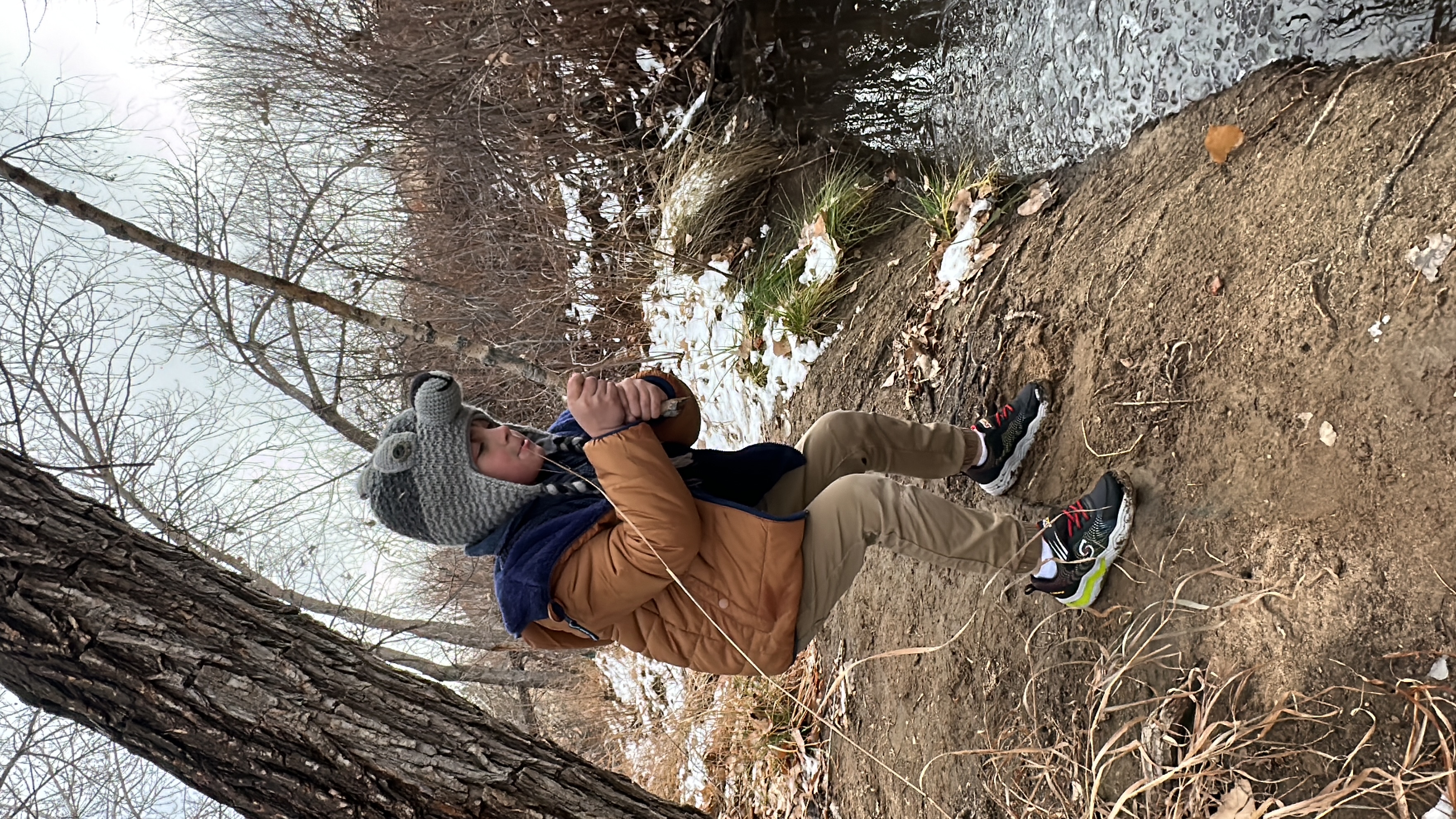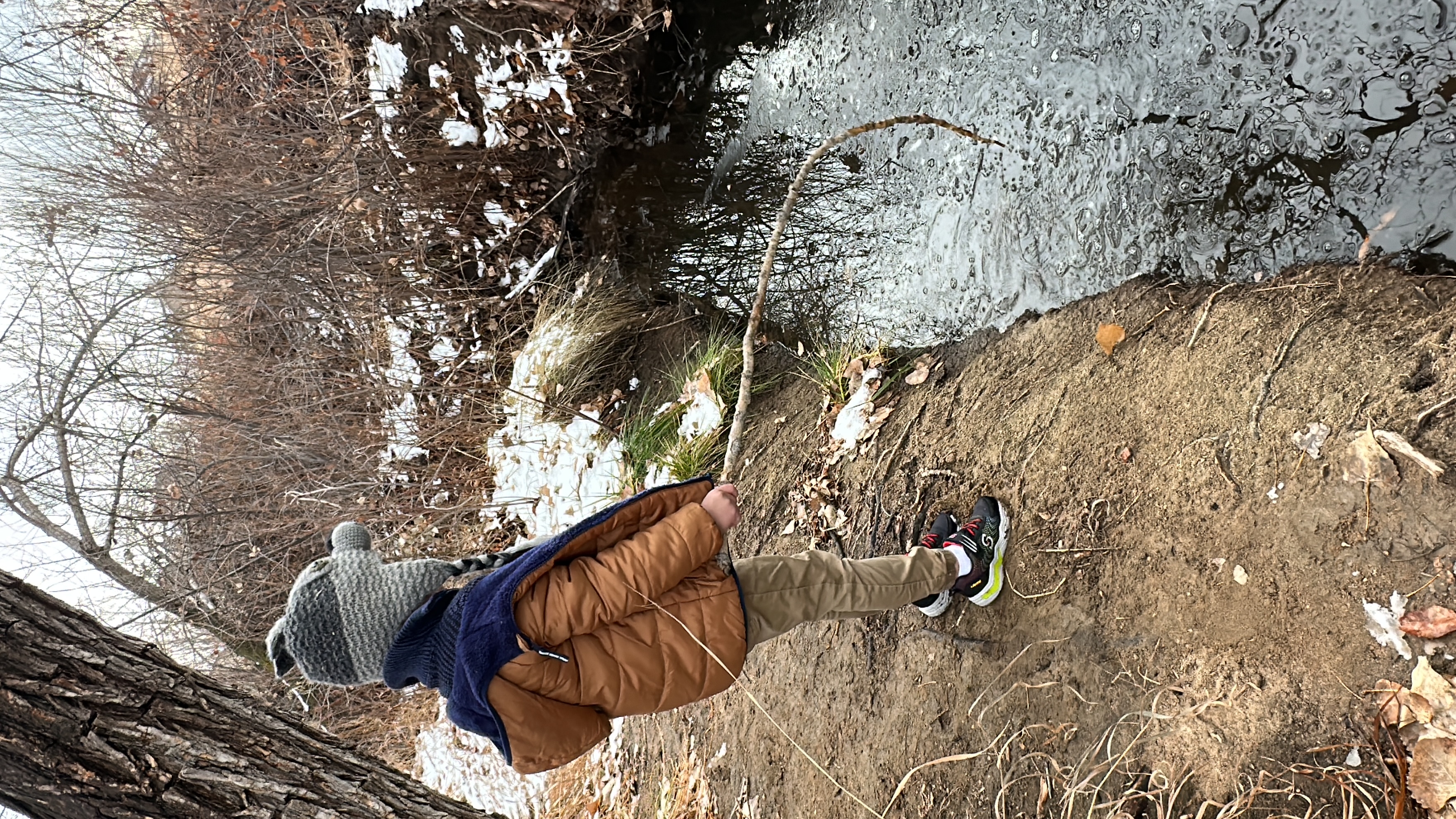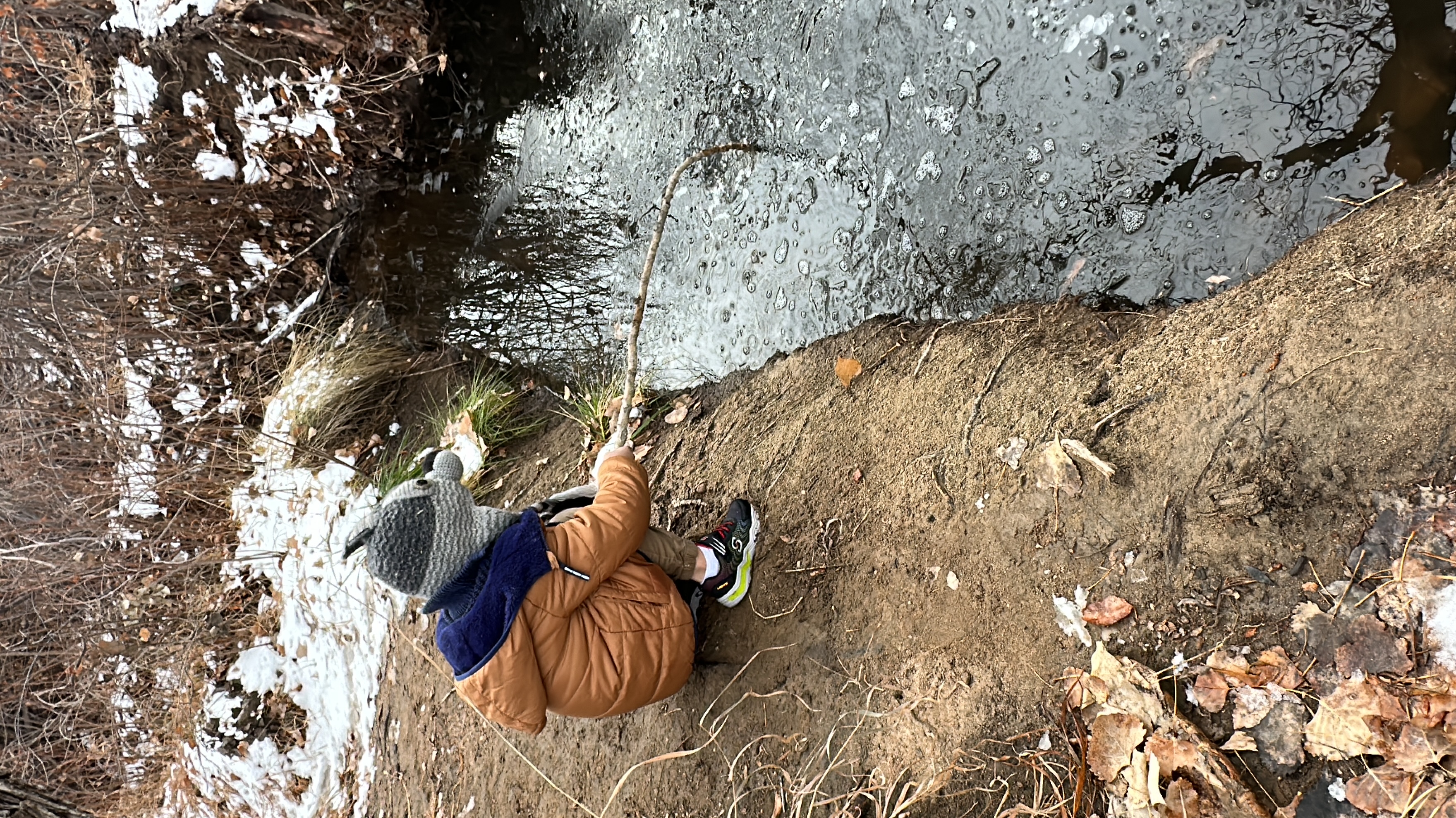 We threw rocks in the ice and made a game to see who could create the most bubbles under the ice. We picked up other ice and sticks and threw it on the ice. We jumped over the creek several times.