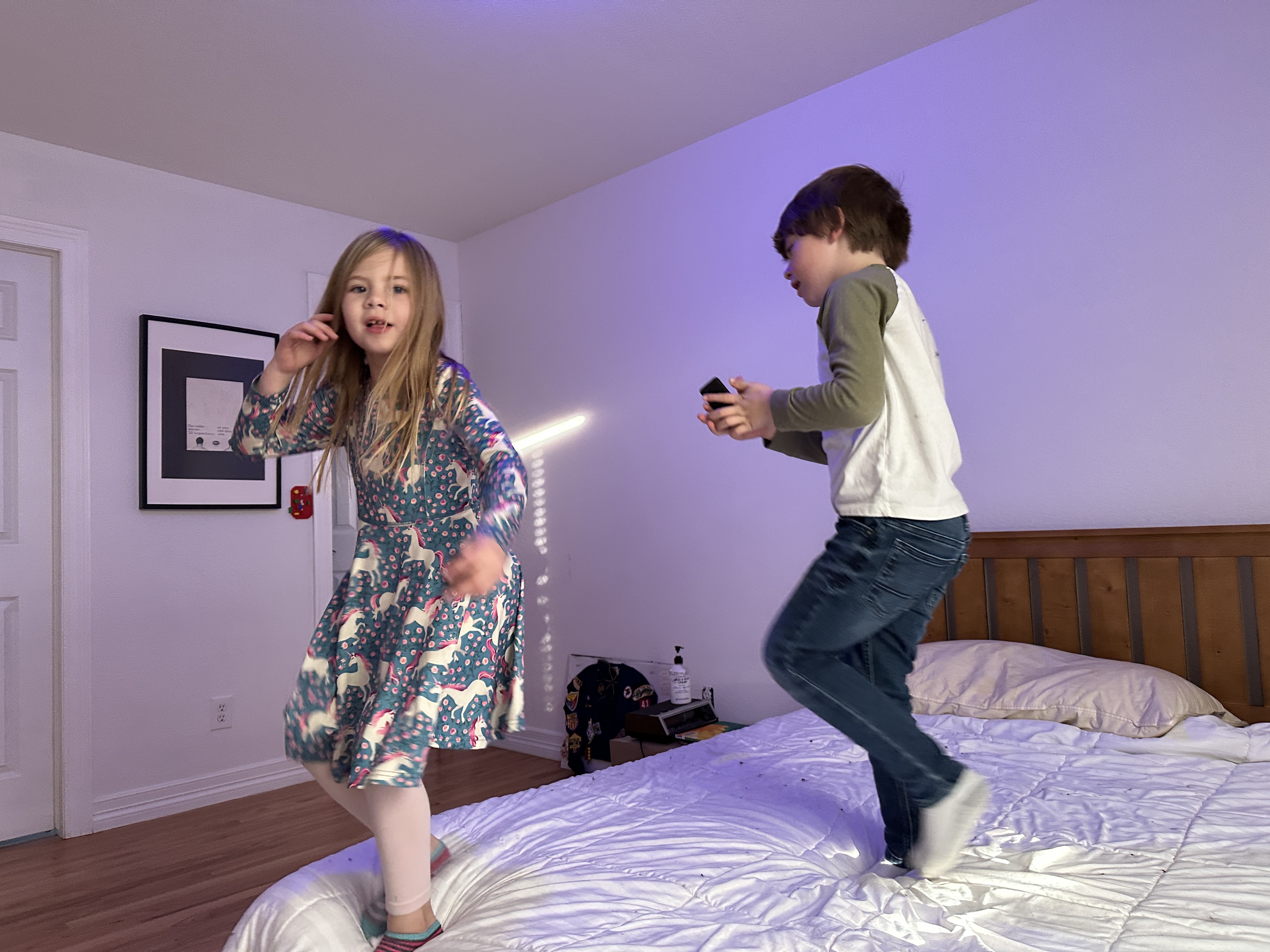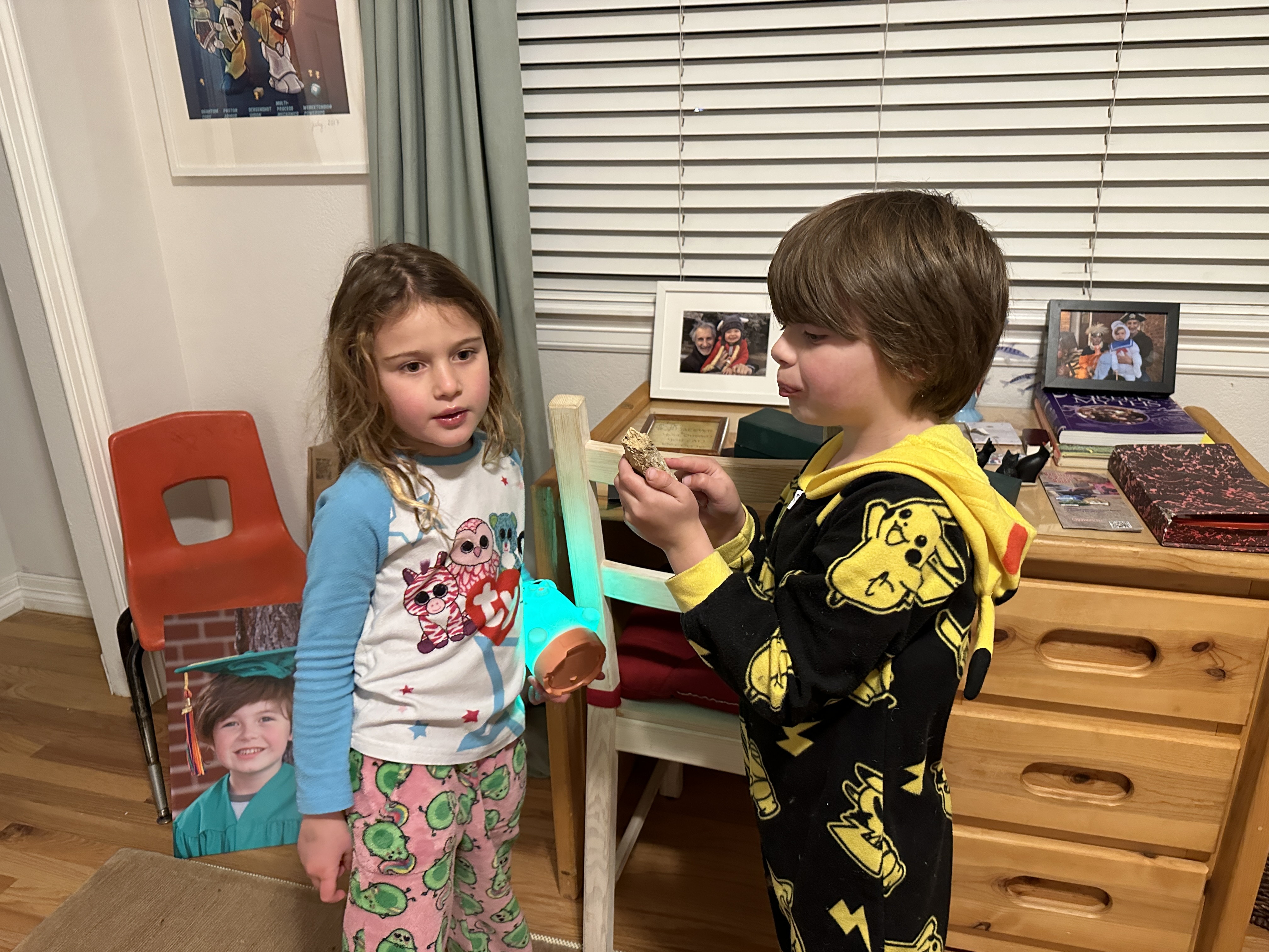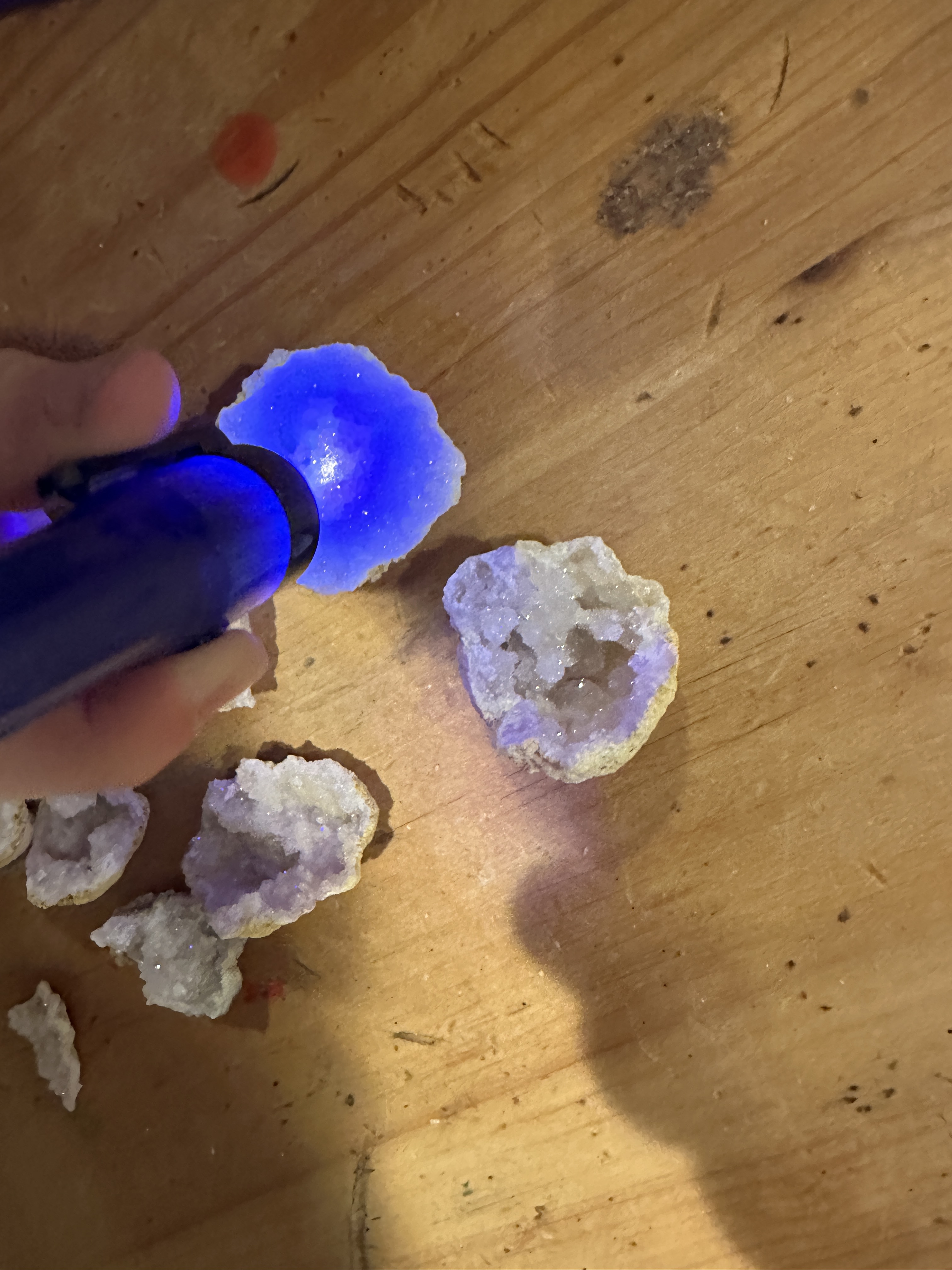 “Daddy! It’s real life!”, Elliot exclaimed several times after breaking open three geodes he got for Hanukkah. Here we are shining the UV flashlight on one. He said it must come from mines. Maybe he means real life versus Minecraft. He knows some rocks in Minecraft are real, like bedrock, but others, like netherite, are not.