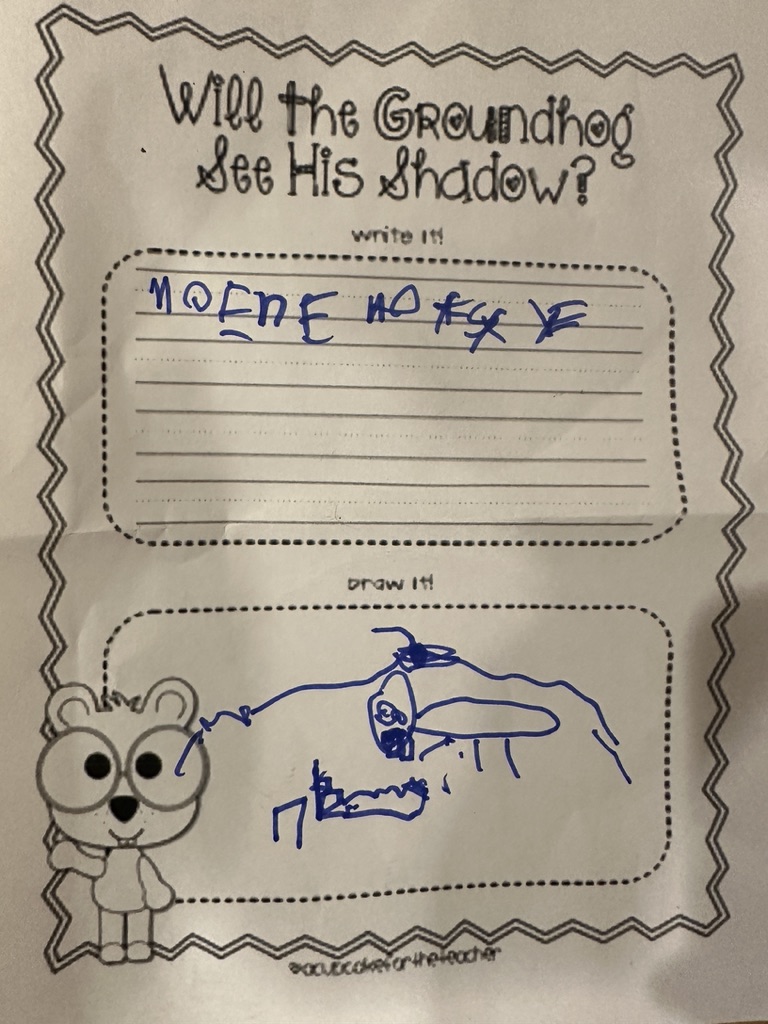 I’m so excited for Groundhog Day!“, Elliot says as he tells me all about the special day tomorrow. He drew this picture in Kindergarten. It’s a groundhog underground. Next to him is a bed. above his head you can see a hole in the ground. I am not sure what the writing says.